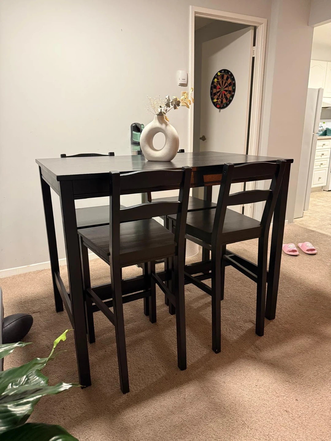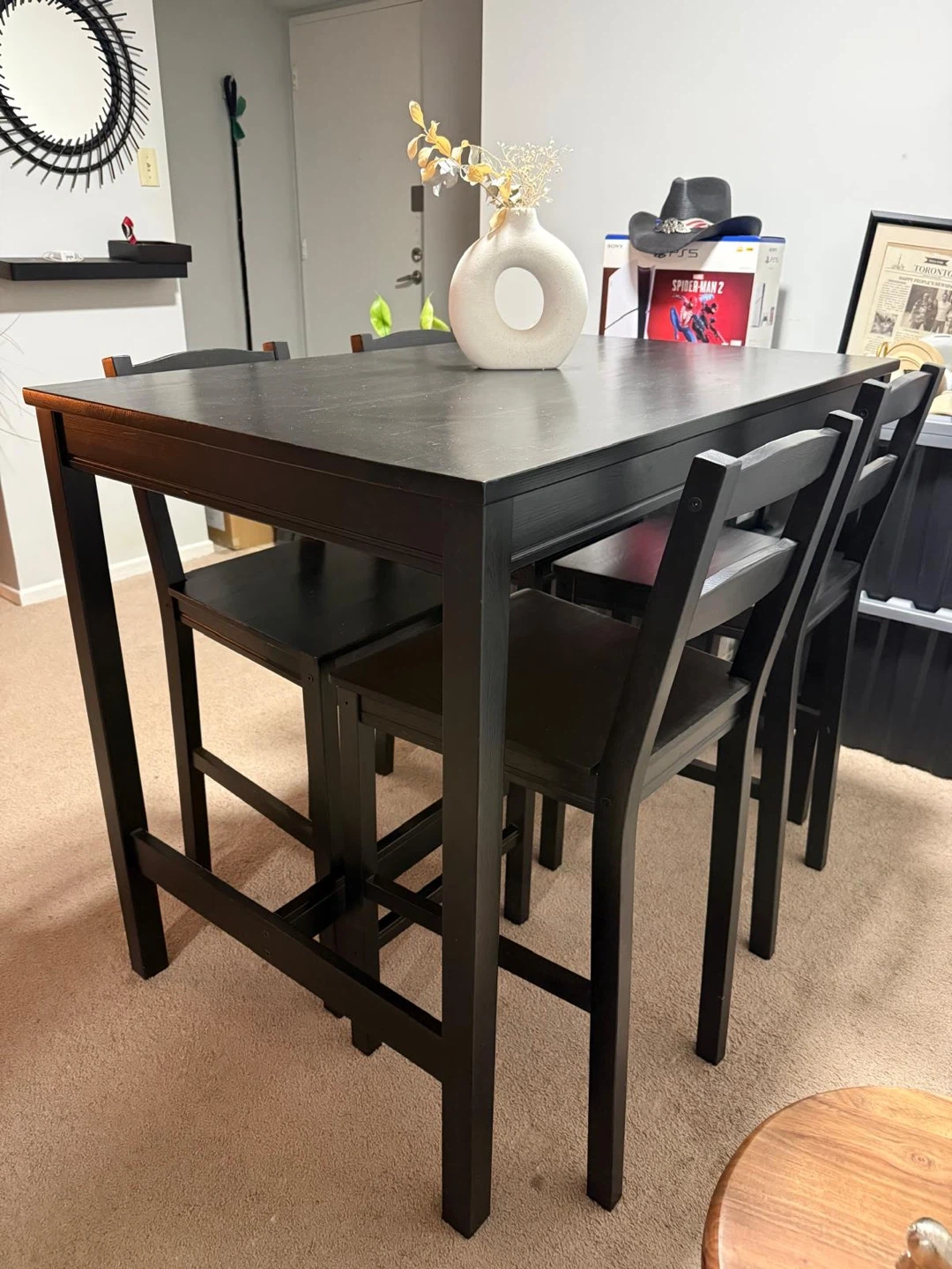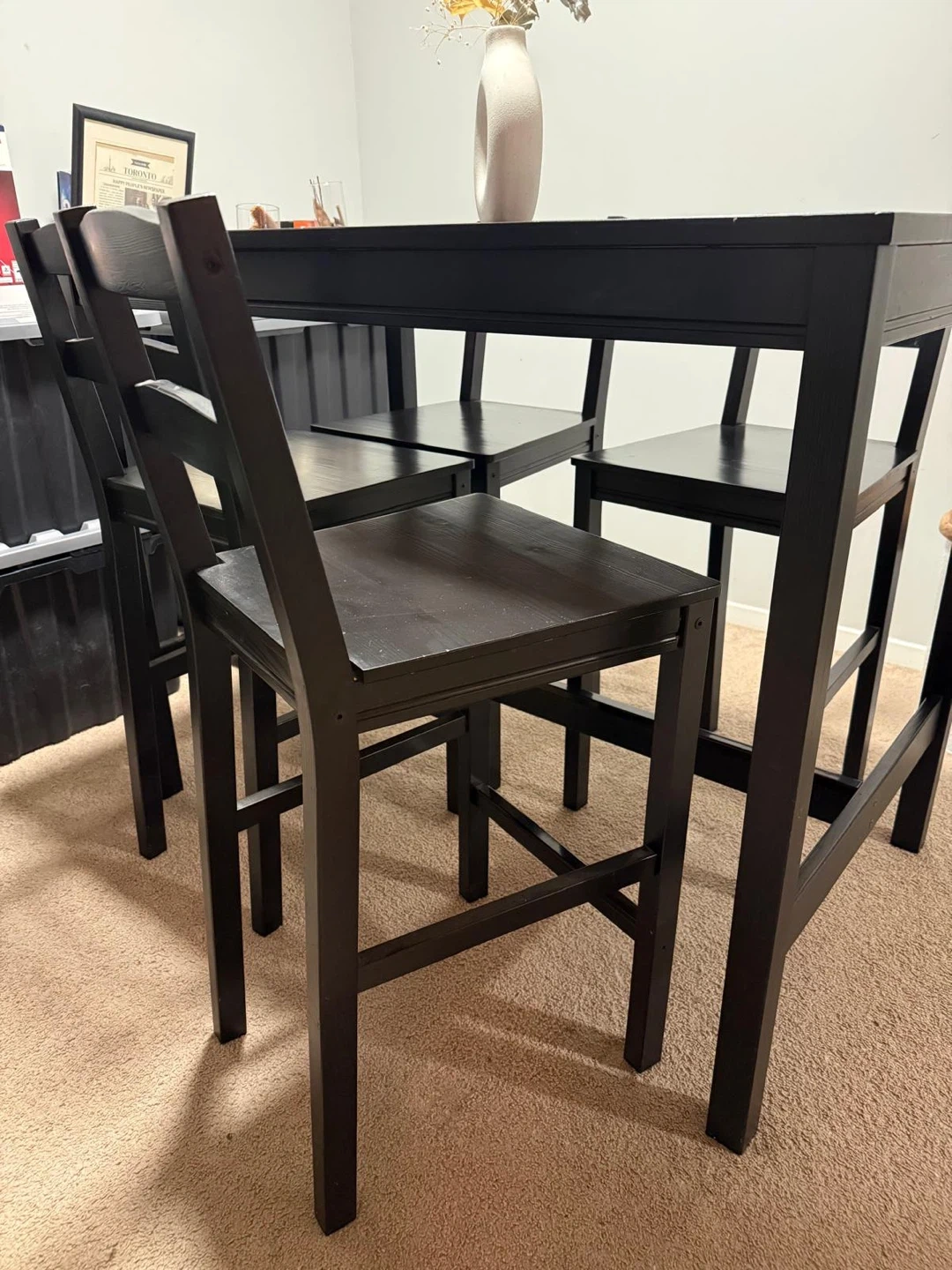 Selling a black dining high table with four matching chairs like bar stools its’ in a great set for a smaller space or apartment! The set is in good condition and ready for a new home. Only one chair is missing a wood piece not impacting anything in the chair