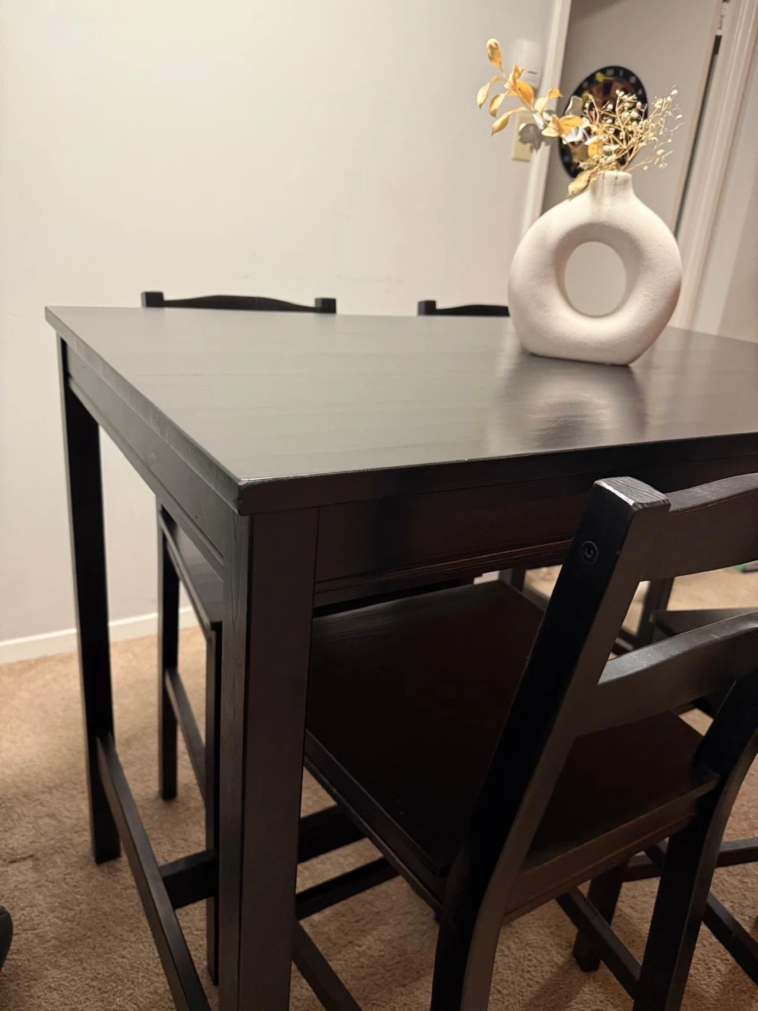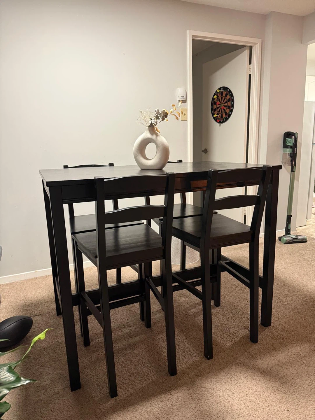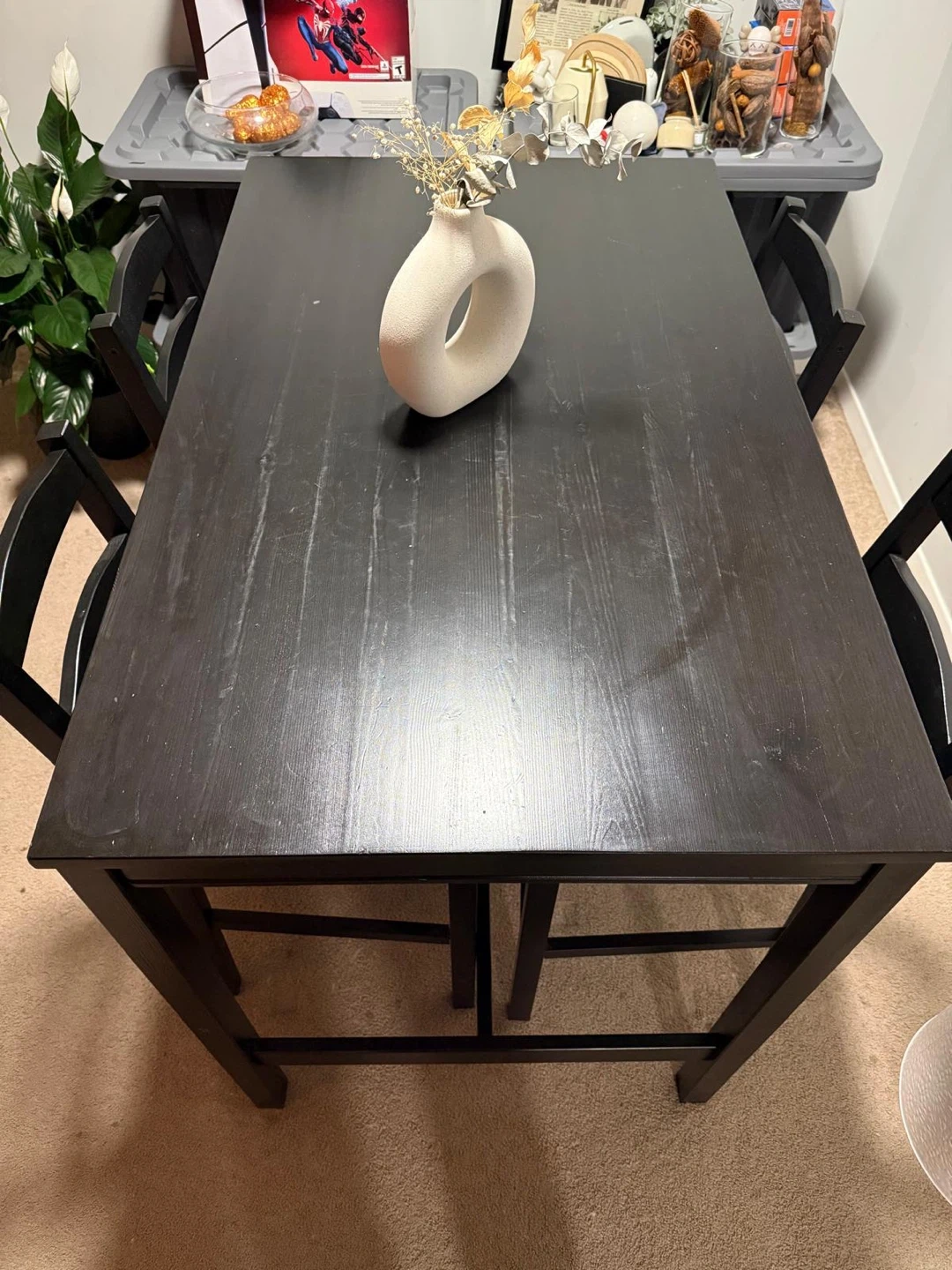 Selling a black dining high table with four matching chairs like bar stools its’ in a great set for a smaller space or apartment! The set is in good condition and ready for a new home. Only one chair is missing a wood piece not impacting anything in the chair