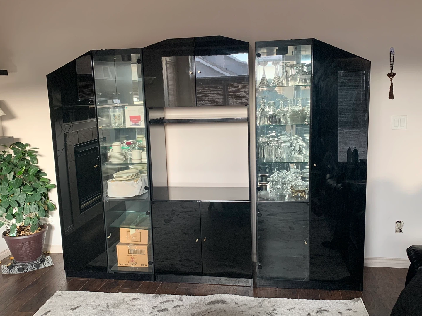 5Selling a sleek black display cabinet. It features glass doors, perfect for showcasing your favourite items. The cabinet has a modern design and ample storage space. It's in great condition and ready to add a touch of elegance to your home