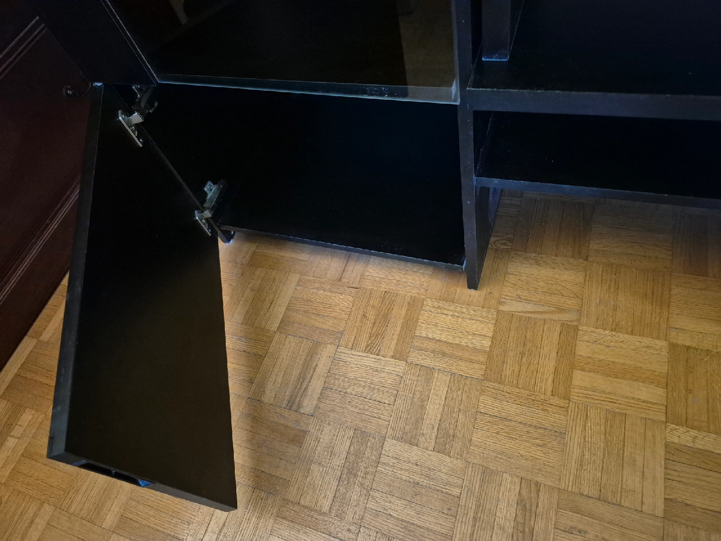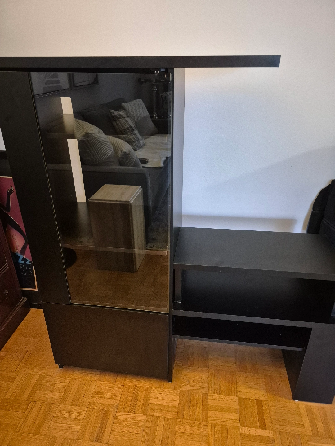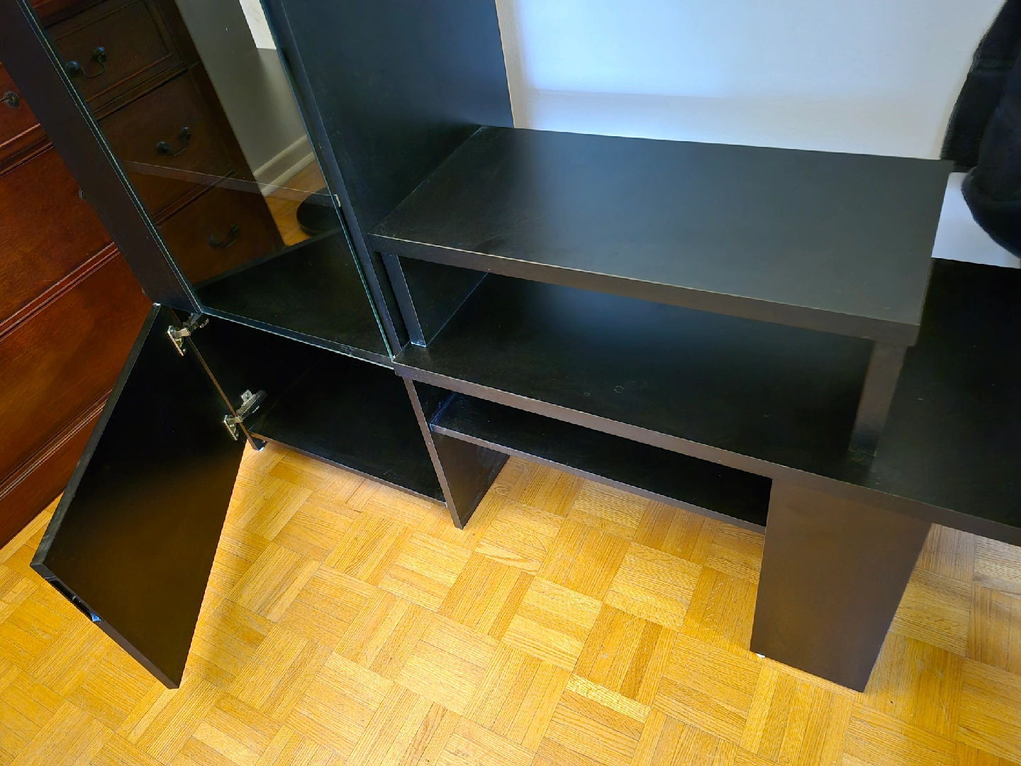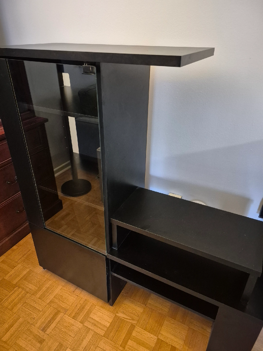 10Selling a black display cabinet with shelving! It's in great shape and would be perfect for displaying your favourite items or for extra storage. It features a glass door section and open shelving on the side With additional monitor stand no pets/ no smoking/no bugs cash only Midtown