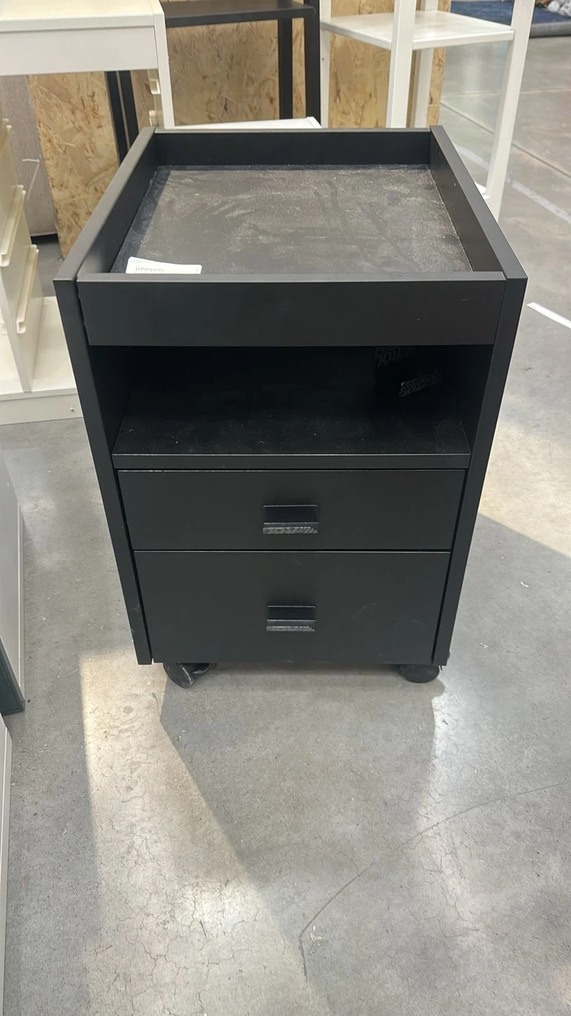 60Here's a black dresser with two drawers! It's in good condition and would be perfect for a bedroom or office. It also has wheels for easy moving