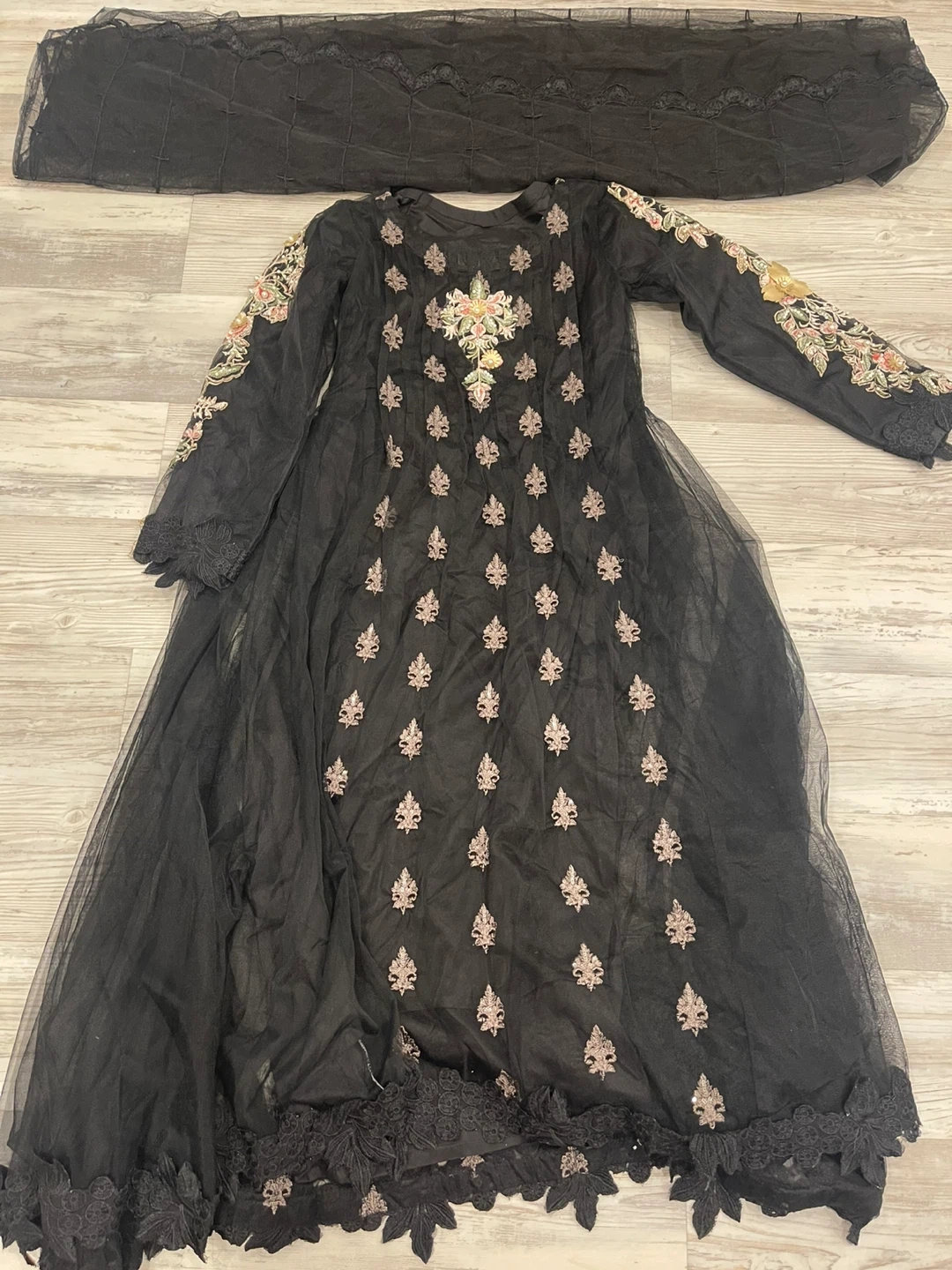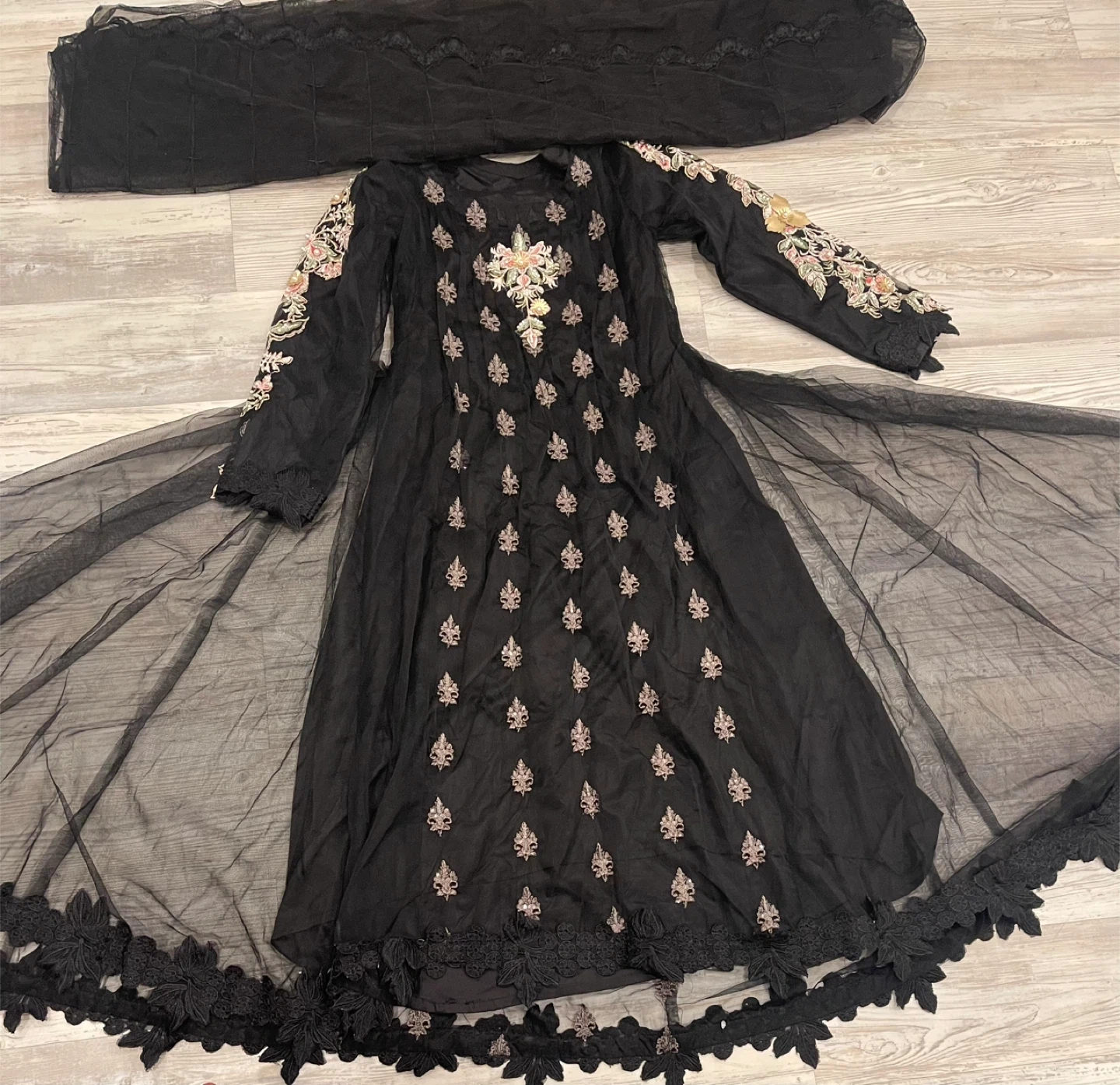 10Beautiful black Anarkali dress with intricate embroidery and a matching dupatta. The dress features delicate floral 3D embroidery with beads on the sleeves and bodice, with a flowing, layered skirt. Perfect for special occasions or adding a touch of elegance to your wardrobe! A detail peace of artwork. Chest 18.5 plus inside alterations space. Set price cash payment only.