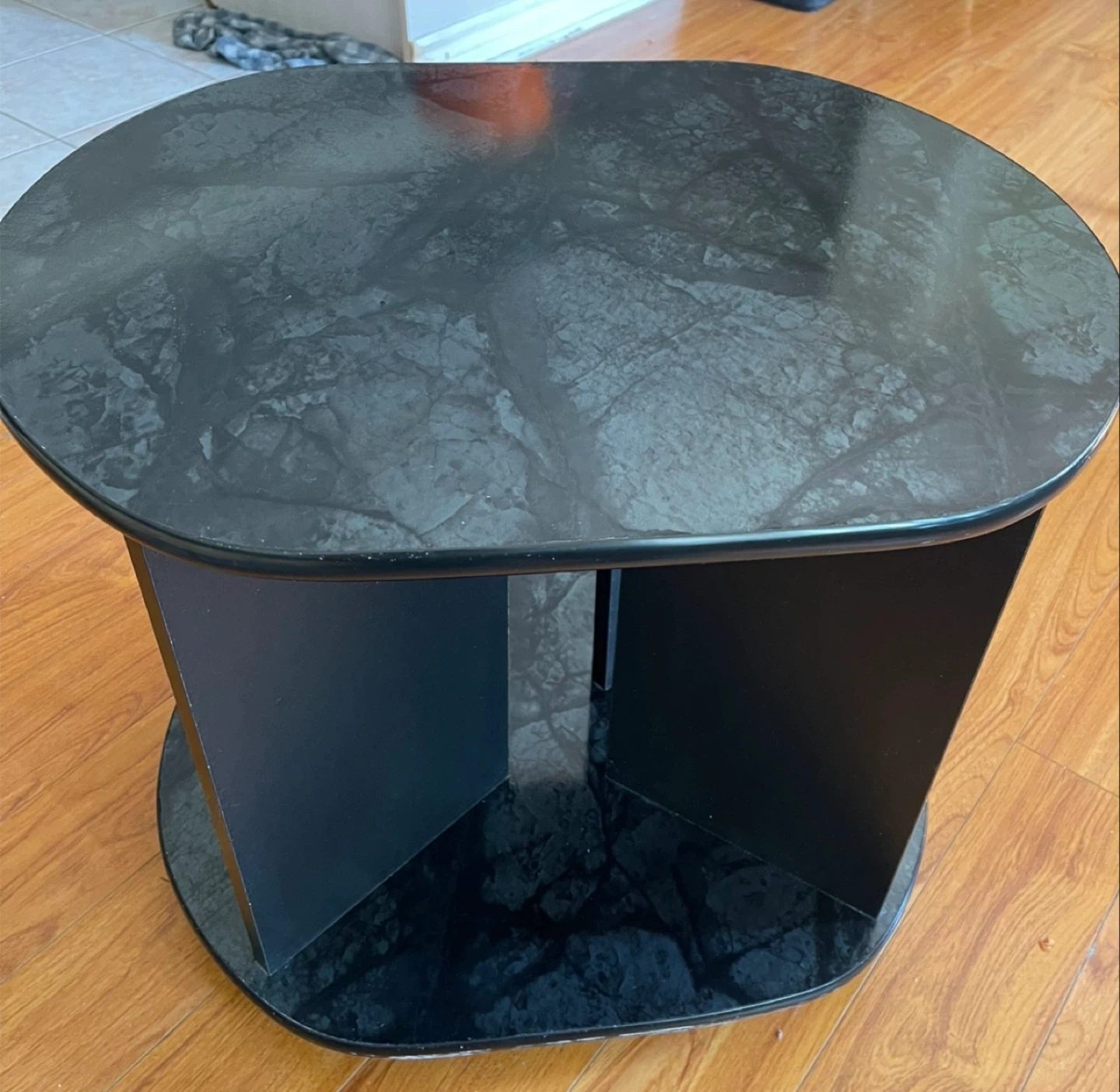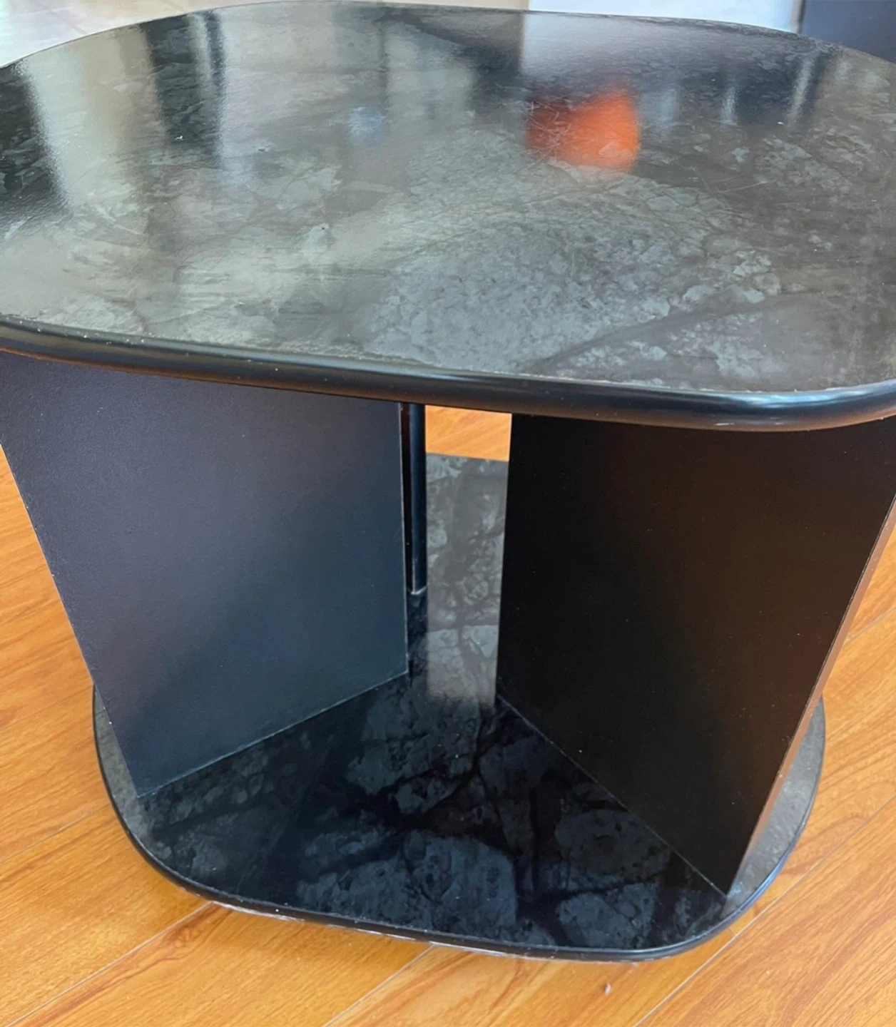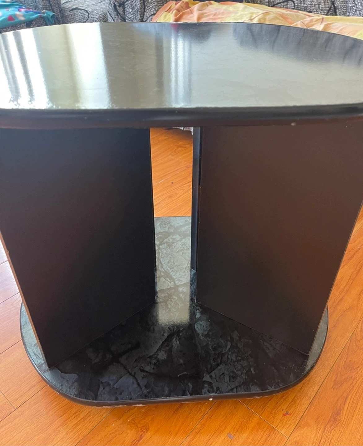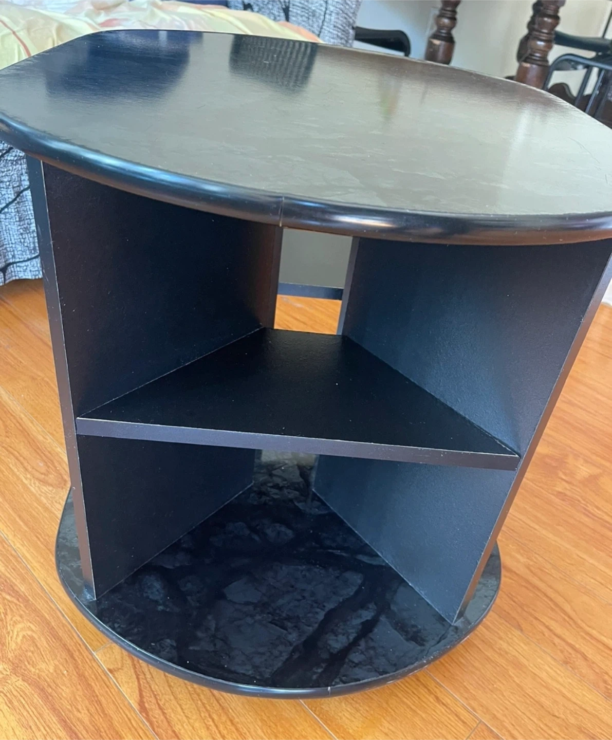23This is a black end table with a shelf. It's in good condition and would be a great addition to any room