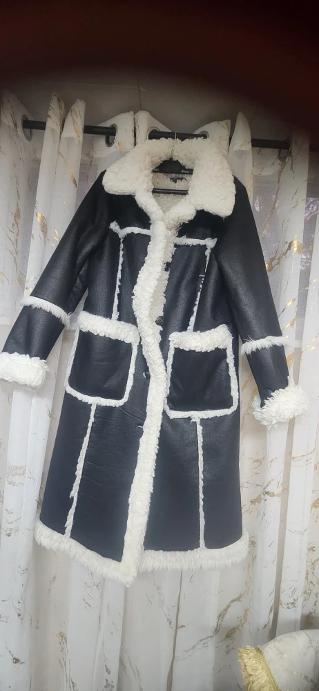 15Stylish black faux leather coat featuring white fur trim. It's in great condition and ready to keep you warm this winter!