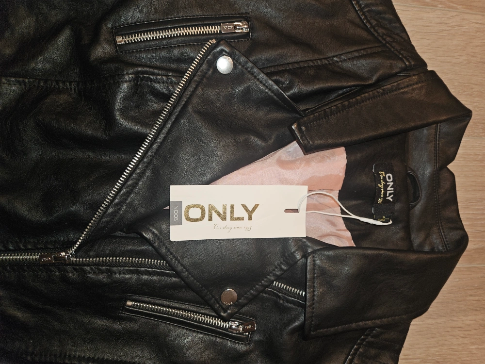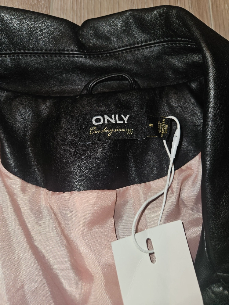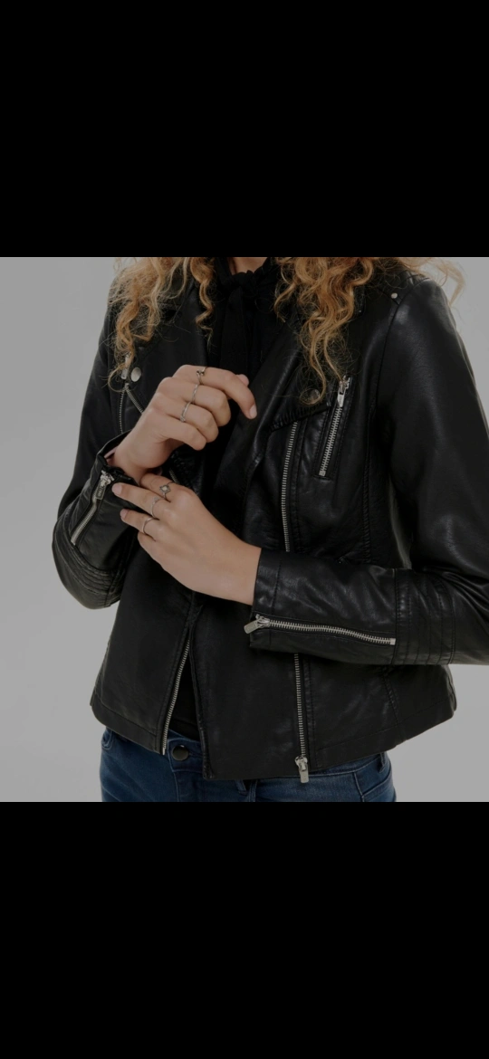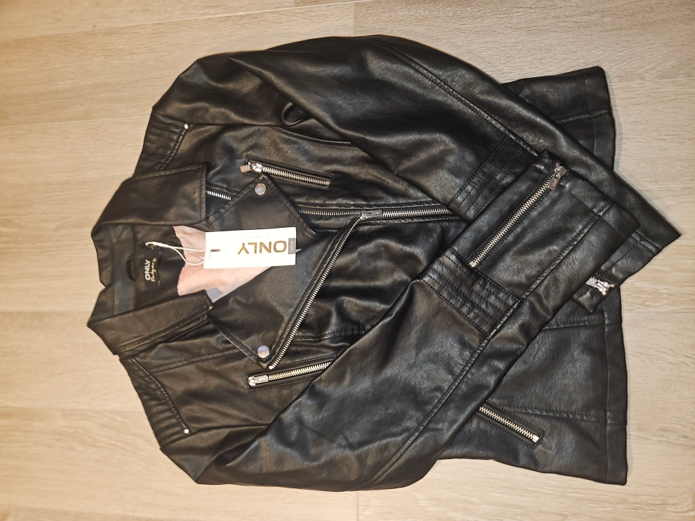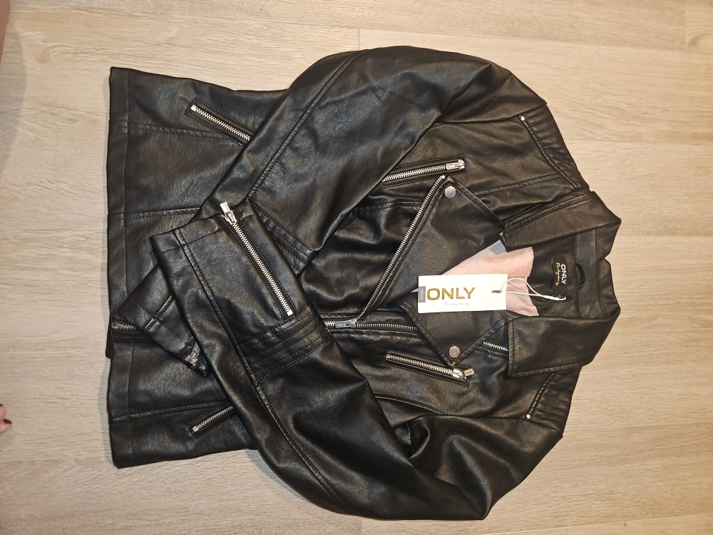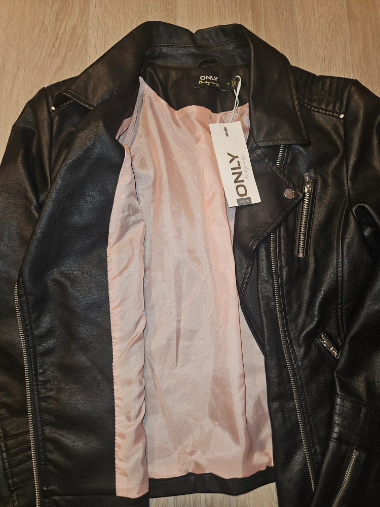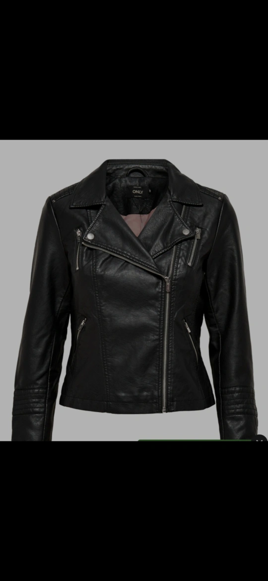 59Black faux leather jacket with a zipper closure, a collar, and two pockets. It is a fitted jacket with a modern style.