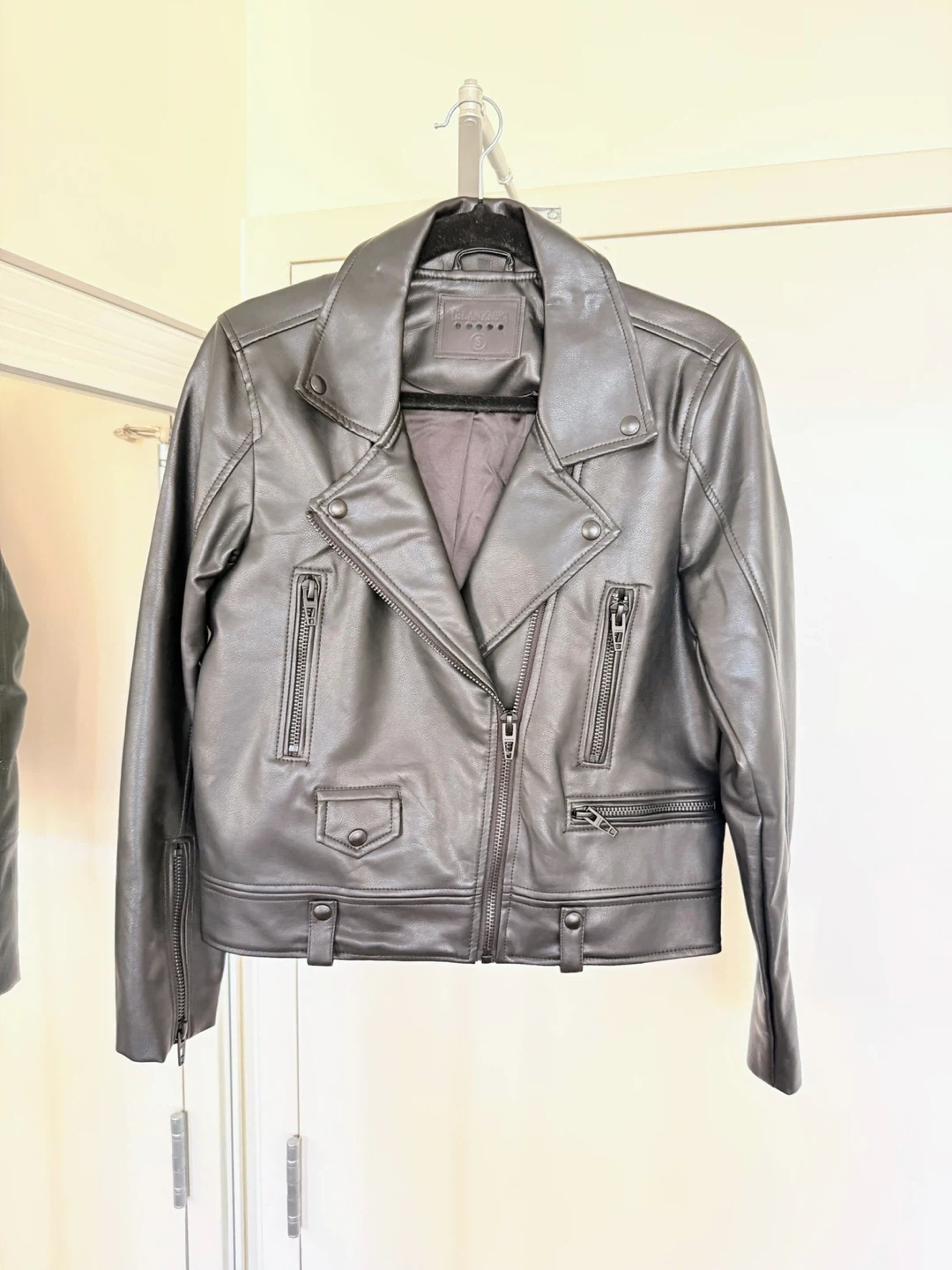 73Selling a Blank NYC faux leather moto jacket in black. It's a size small and in great condition, never worn Perfect for adding a bit of edge to your wardrobe. Looks grey in photos but a true black. I’ve got a lot of great items that need to clear out so check out my stuff and make an offer!