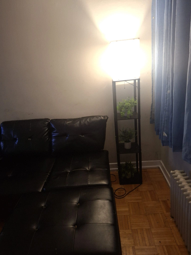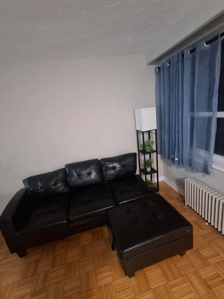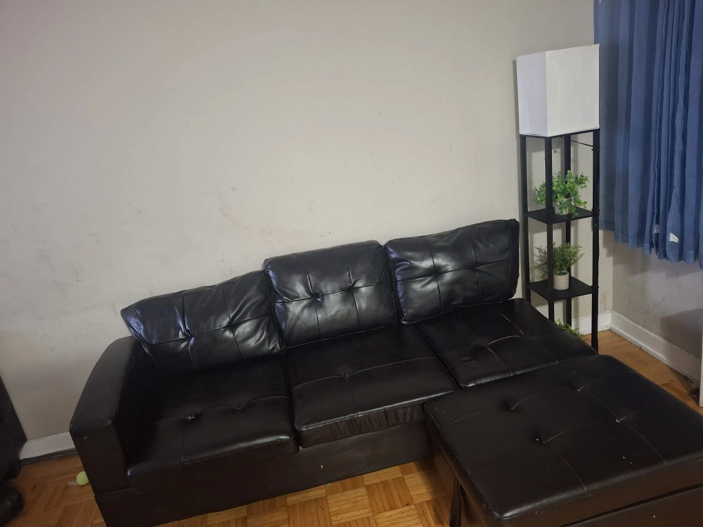 16Selling a black faux leather sectional sofa that comes with an ottoman! It's in good condition and would be a great addition to any living room or den. One of the sofa leather is slightly ripped and back is slightly shaky.