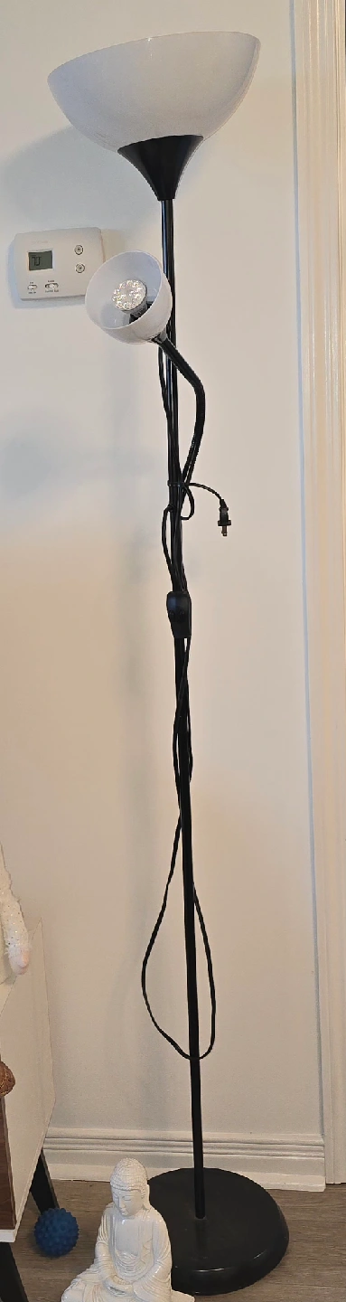 60Selling a floor lamp in great condition! It features a main upward-facing light and an adjustable reading light, perfect for any room. The lamp has a sleek black finish that will complement any decor.