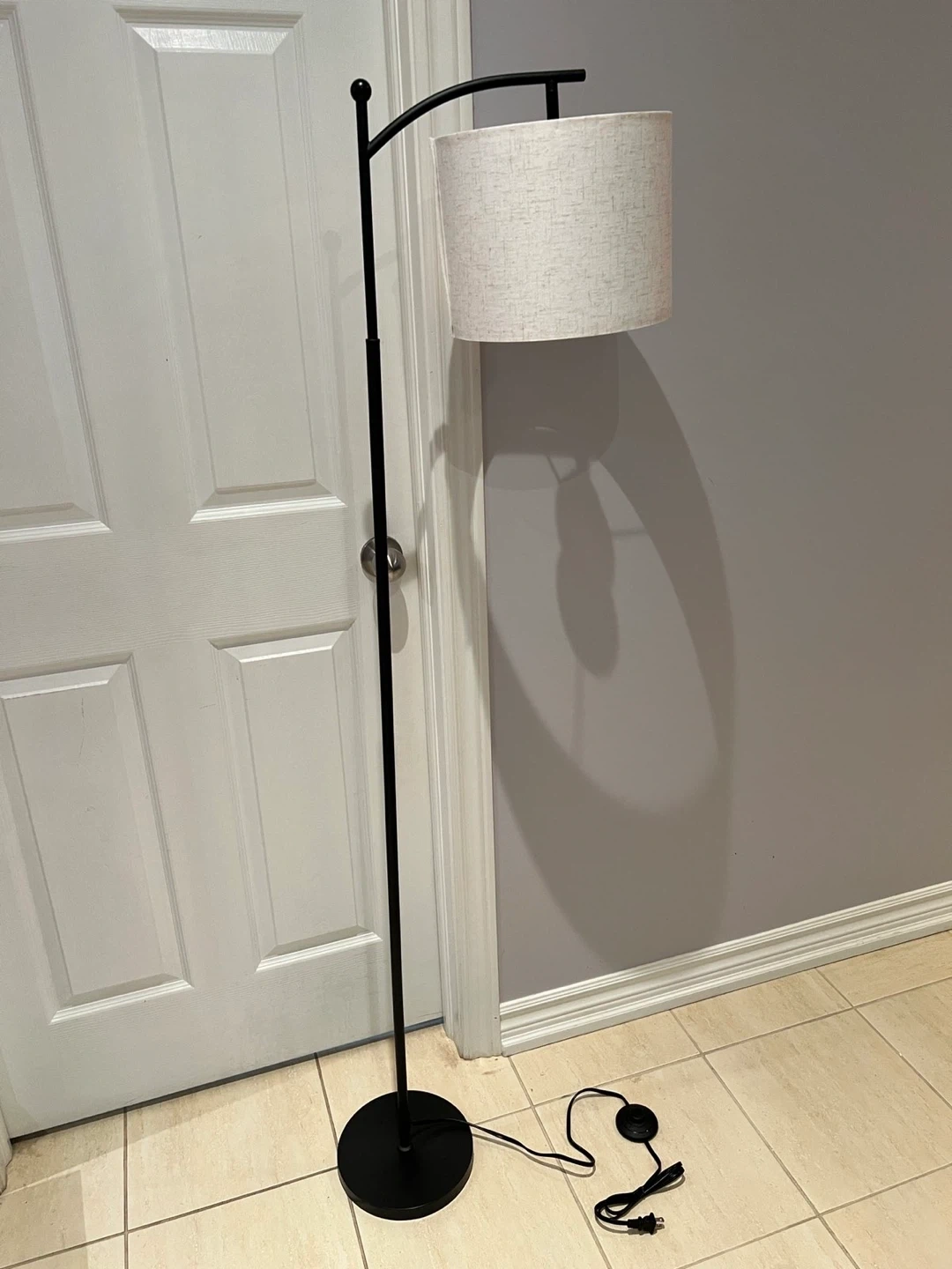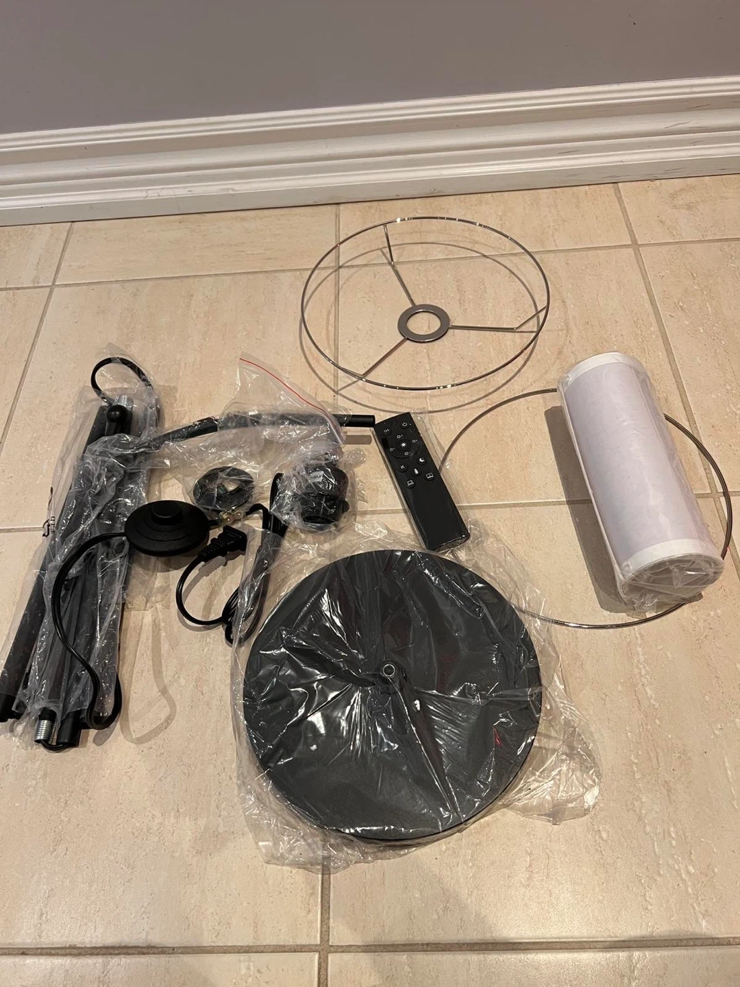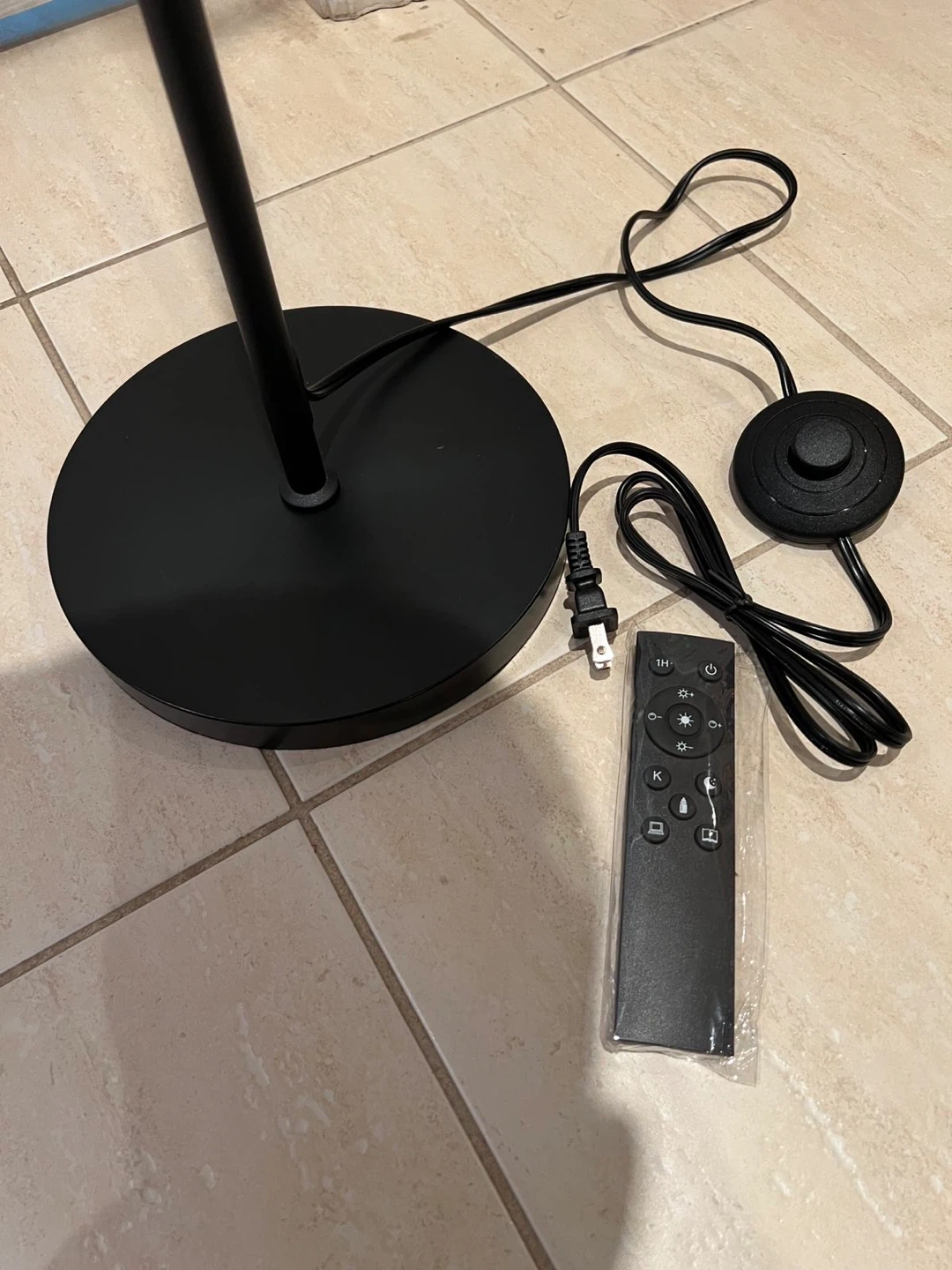 189Selling a stylish floor lamp featuring a black stand and a beige shade. It comes with a remote for easy control. Perfect for adding a touch of elegance to any room!
