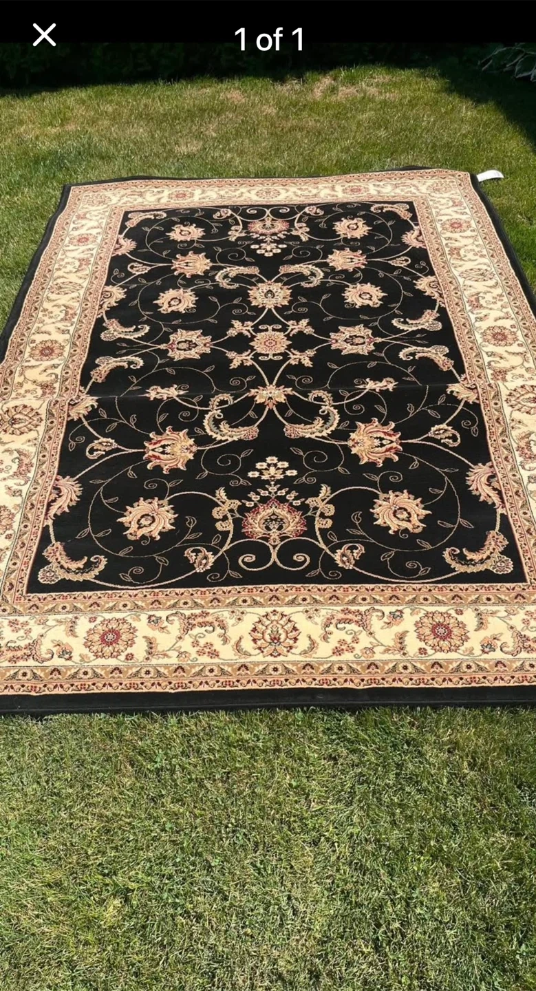10Selling a beautiful area rug with a black background and floral design. It has a cream-coloured border with intricate detailing. Perfect for adding a touch of elegance to any room!
