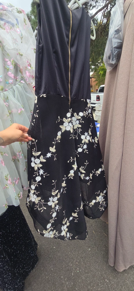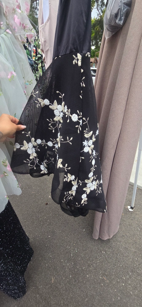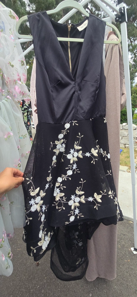 188Black sleeveless dress with a high low hemline. The skirt is made of mesh and features a floral design. It has a zipper closure in the back. The dress is a size small.