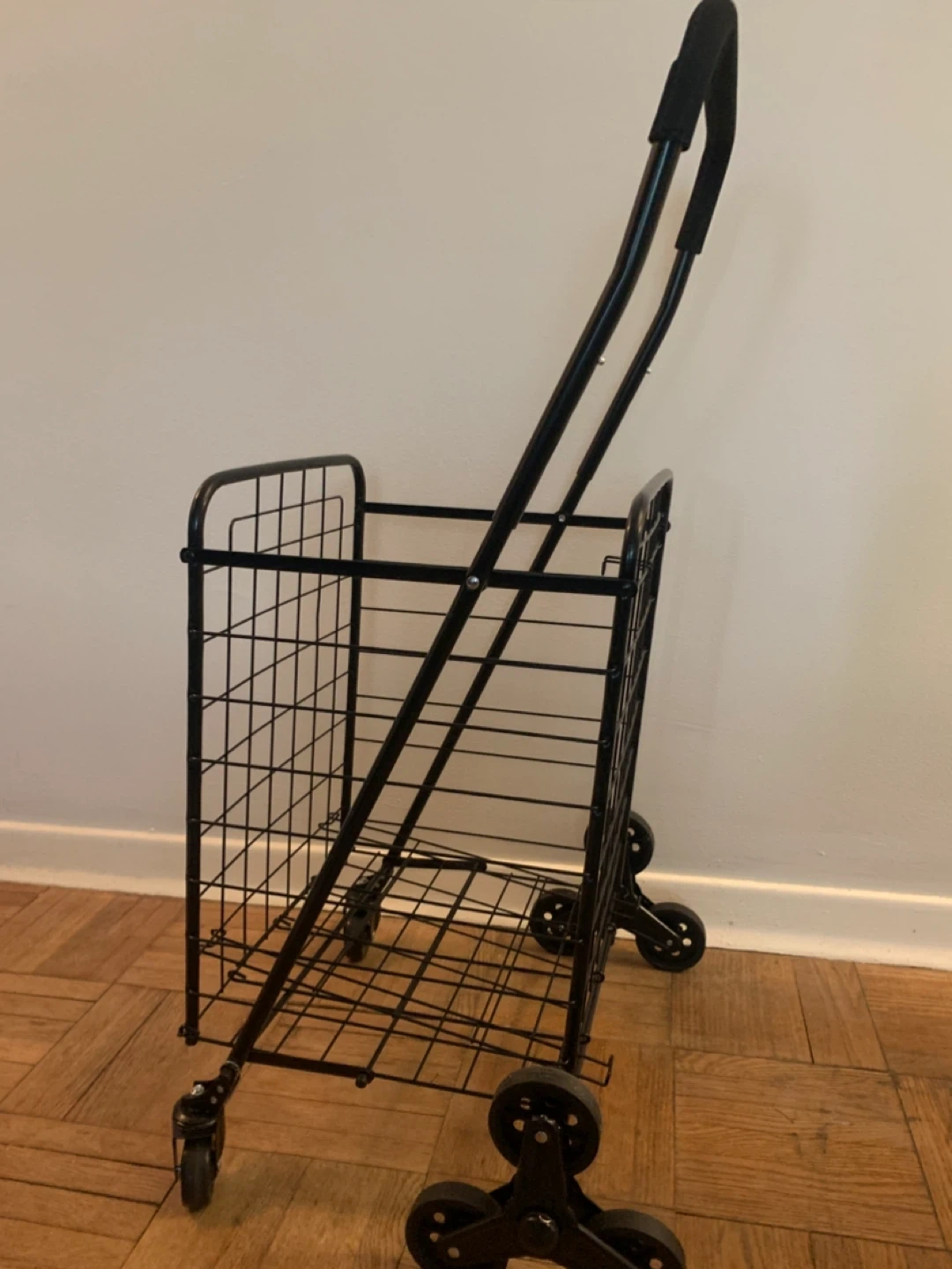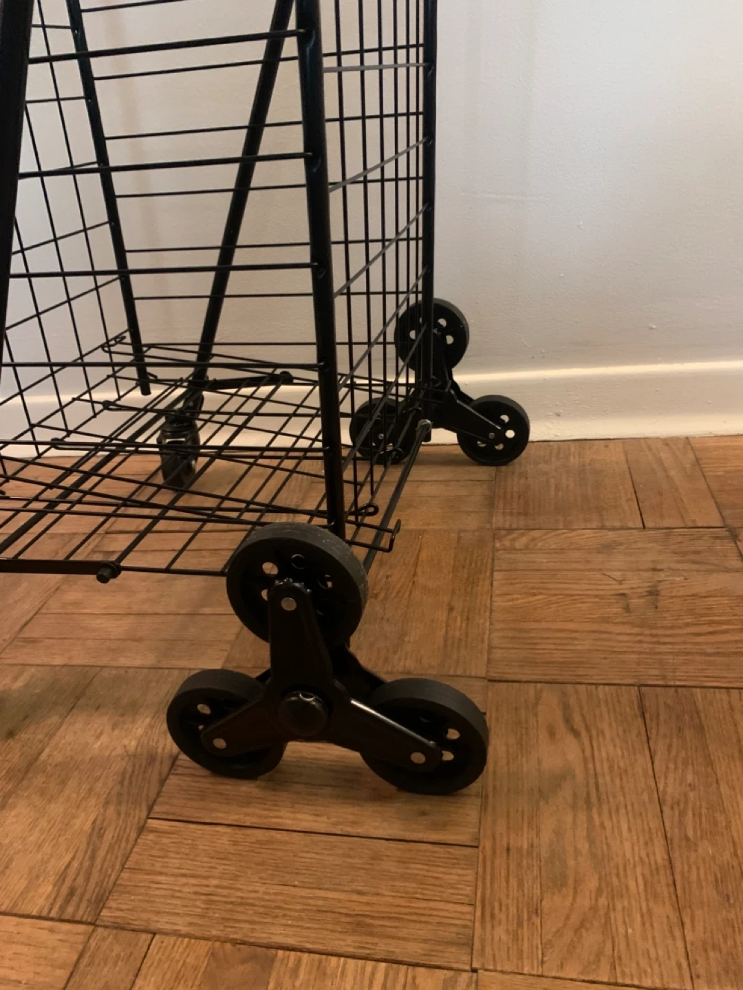 Selling a black metal folding shopping cart. Smaller wheels are made for pulling up stairs. Been used once.