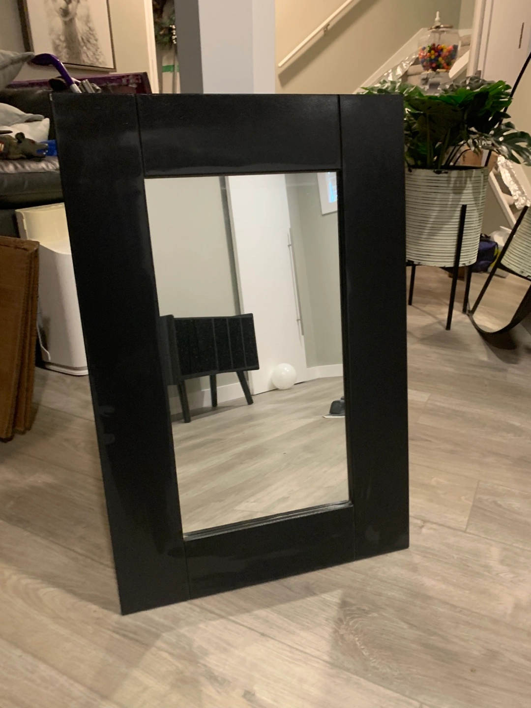 Selling a black framed mirror. It's in good condition and ready to brighten up your space! Perfect for adding a touch of elegance to any room in your home. Could use some paint touch up on the corners