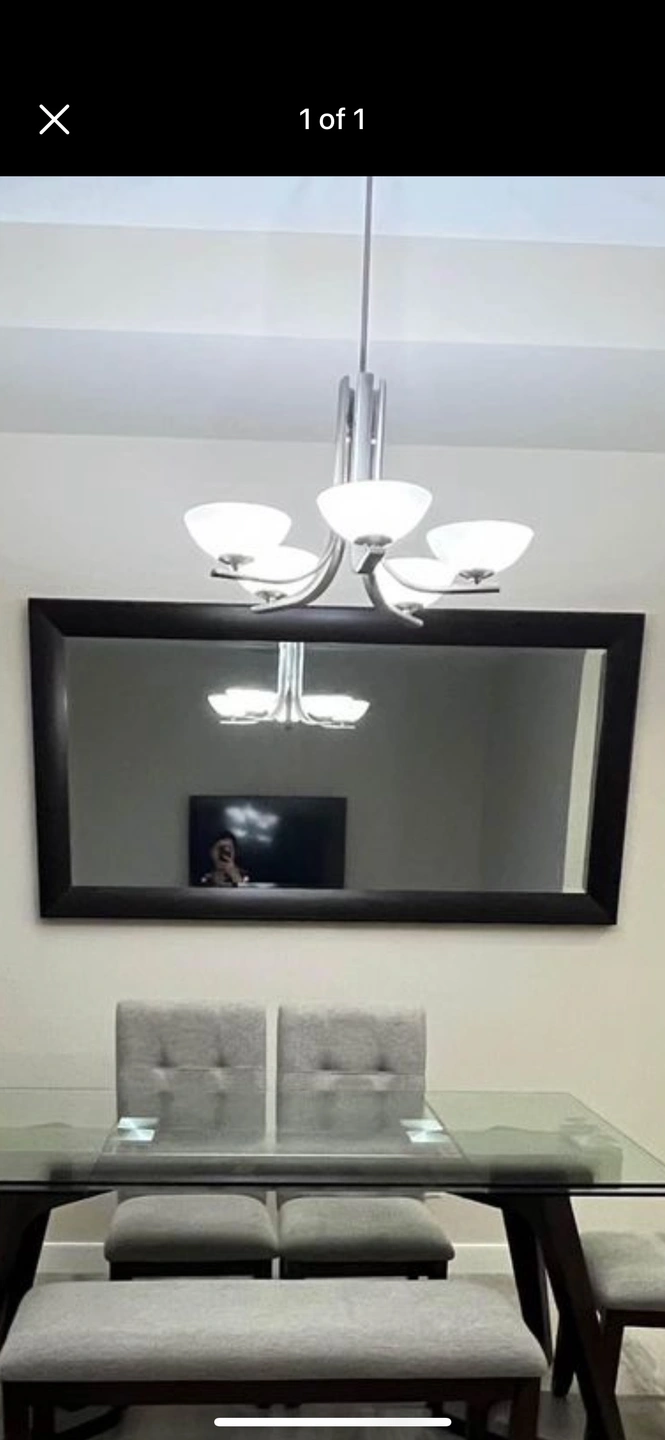 A black framed mirror with a large glass pane. It has a modern design with a wide frame. It is large and rectangular.