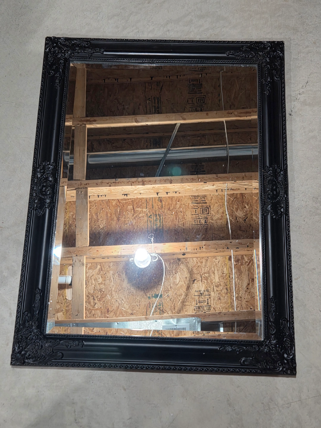 10Selling a black framed mirror. The frame has a detailed, ornate design. It would be a great addition to any room!