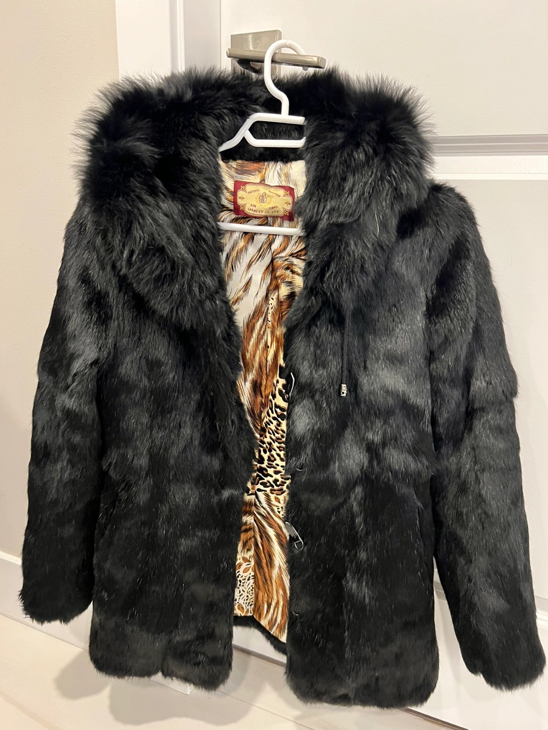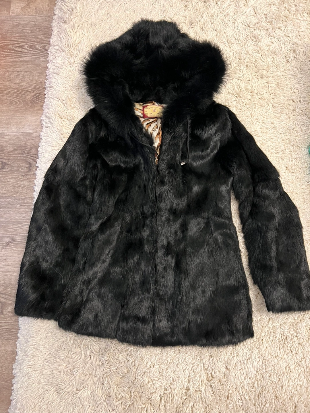 Black fur jacket with a hood. Zipper closure. Lined with a brown leopard print.