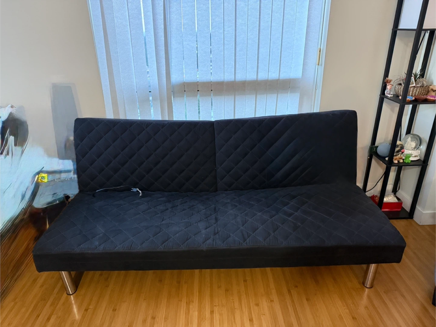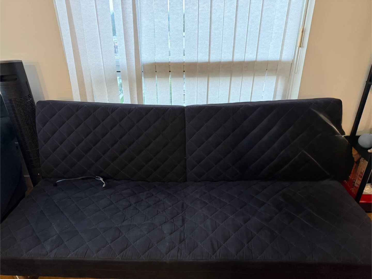 10Selling a black futon sofa bed and dining table with 2-3 chairs. It's in great condition and perfect for small spaces or as an extra bed for guests. The futon easily converts from a sofa to a bed, making it a versatile piece of furniture for any home The dining table is very beautiful