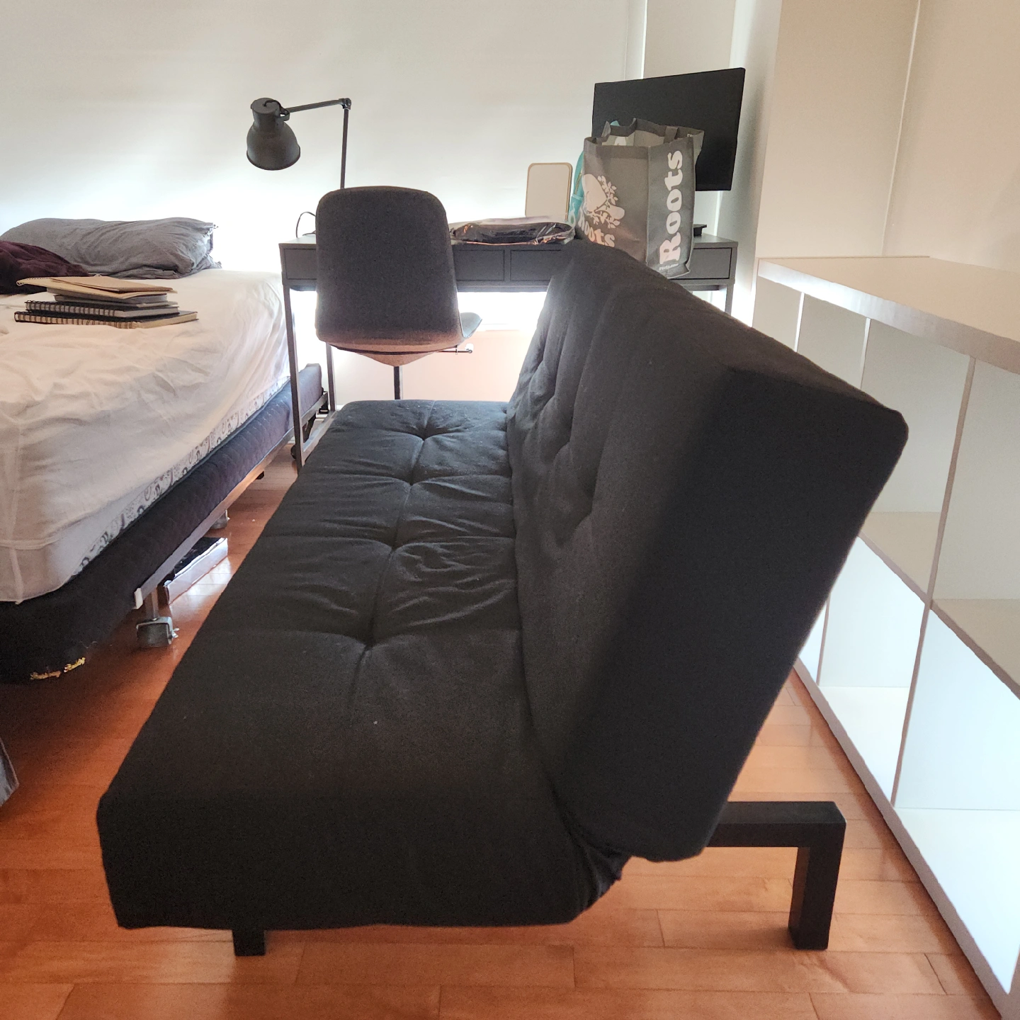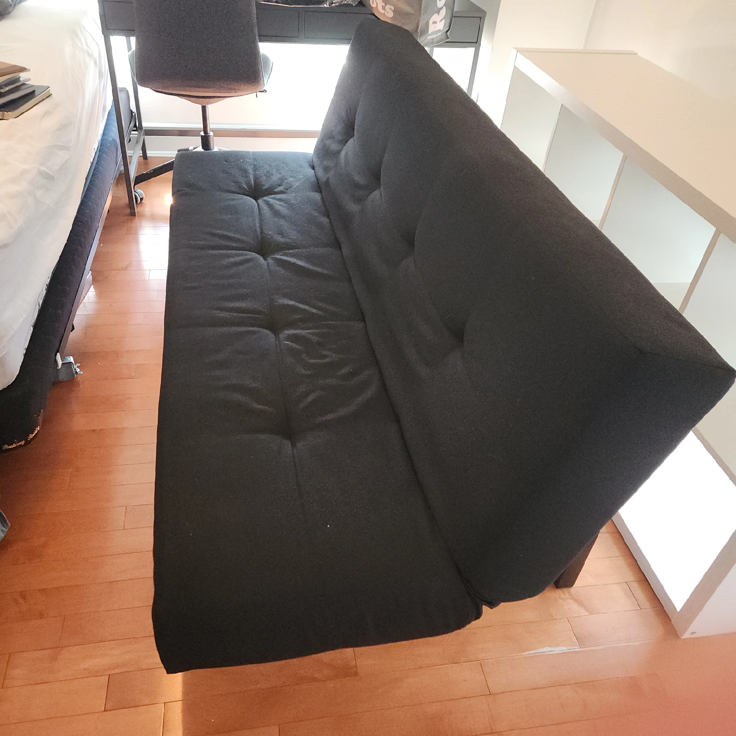 38Selling a black futon sofa bed. It's in great condition and would be perfect for a small space or guest room. This versatile piece can be used as a sofa or easily converted into a bed for overnight guests. You must come pick it up for yourself from my condo. Contact me if interested!