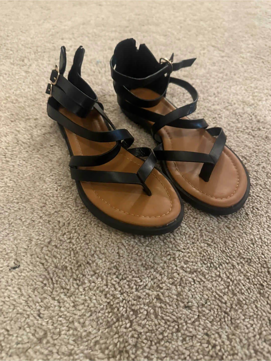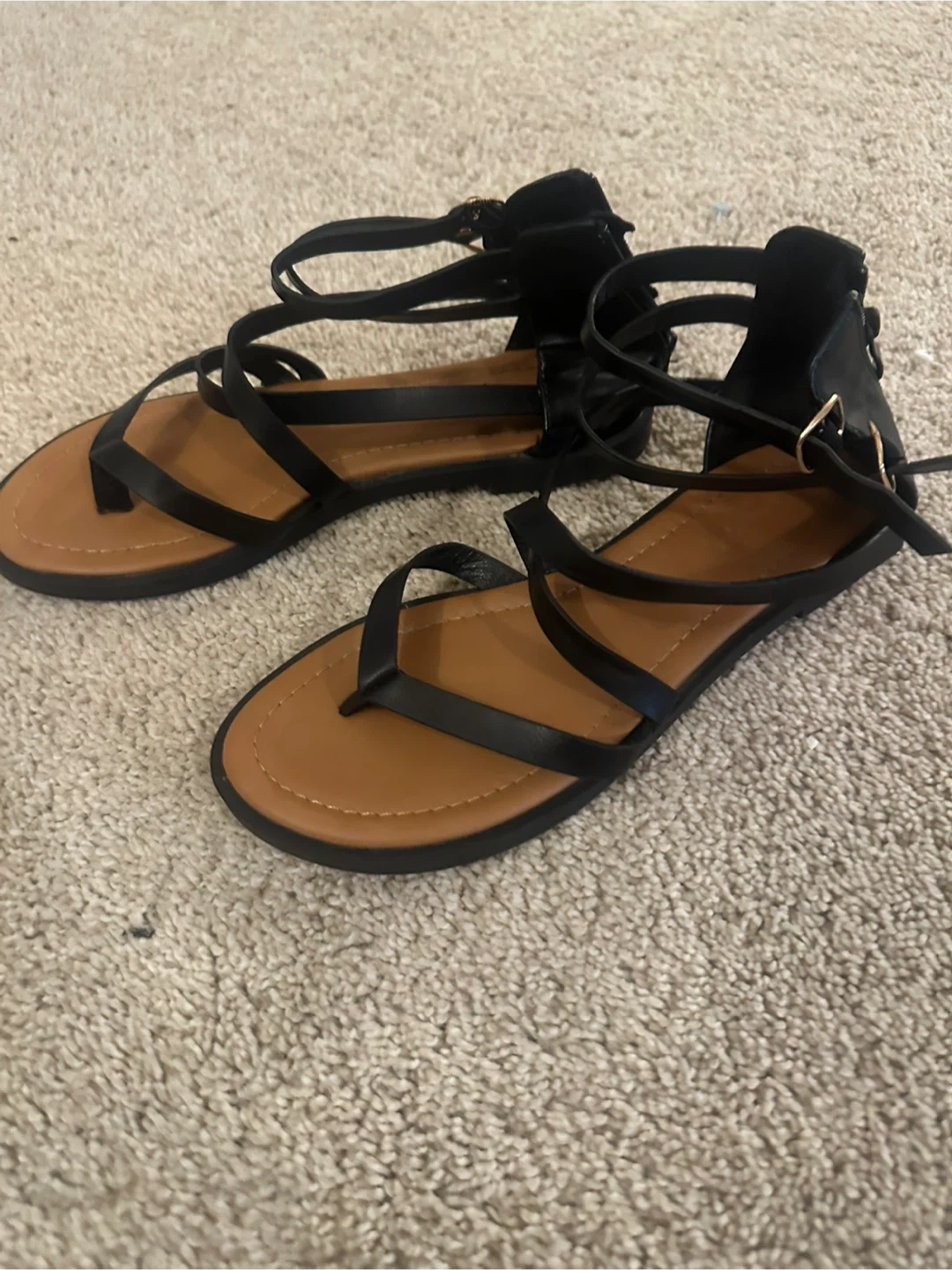 10Cute black gladiator-style sandals in a size 39. They have a tan sole and black straps. Perfect for summer!