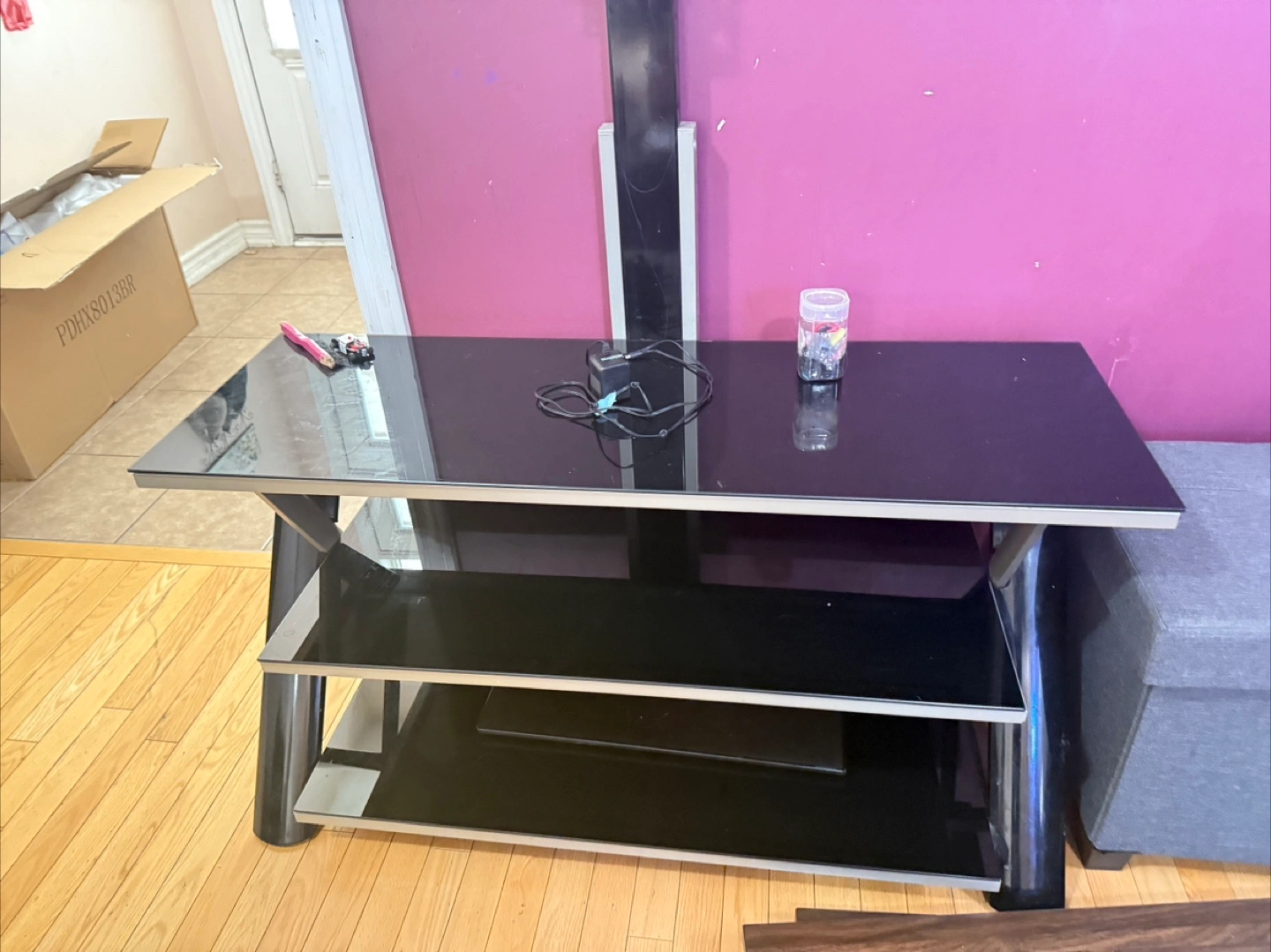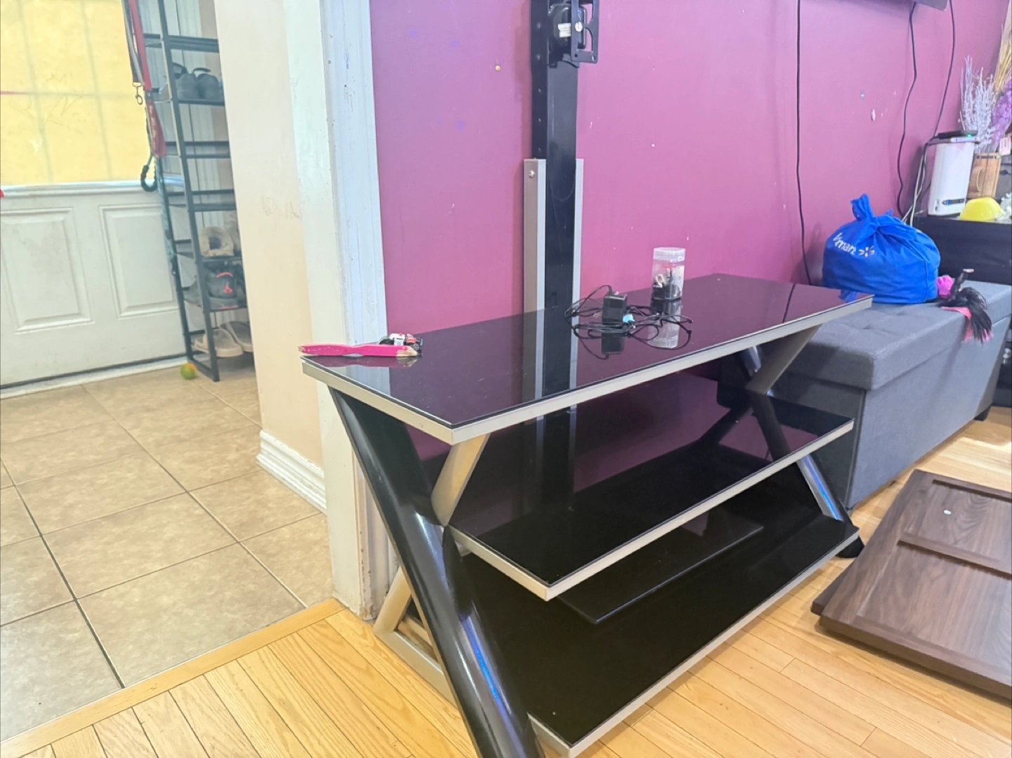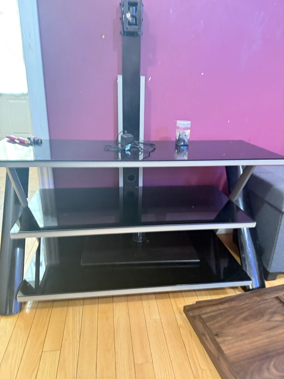 Black entertainment unit. Features glass shelves, with a silver frame. There is a vertical pole attached to the back with a mount for tv. Enjoy watching your favourite shows, with this piece.