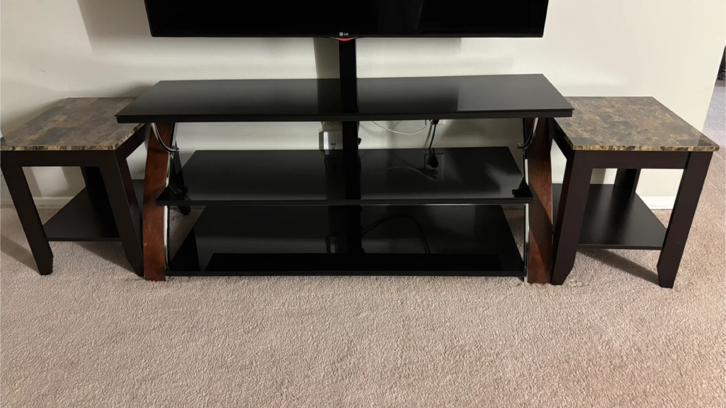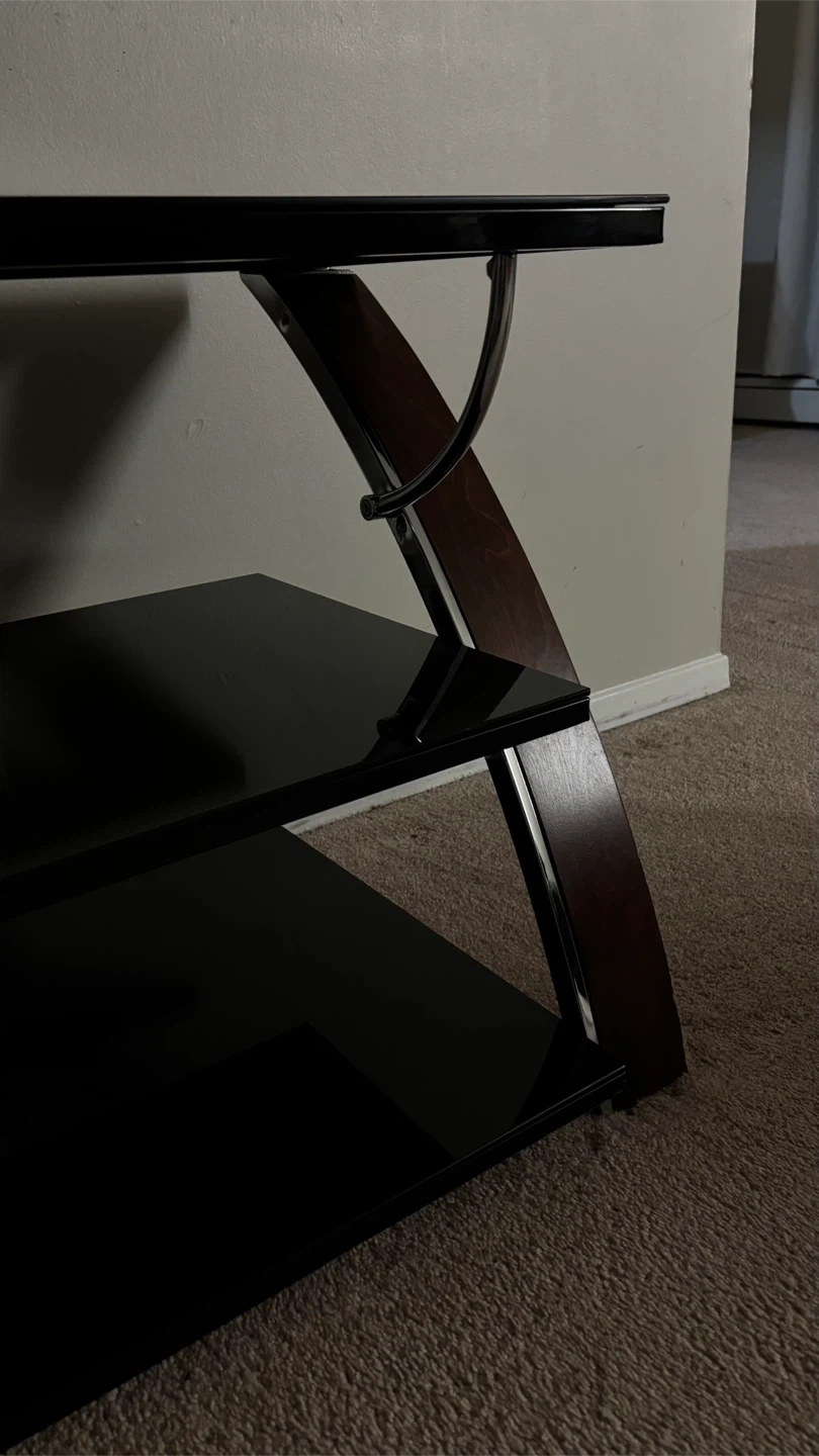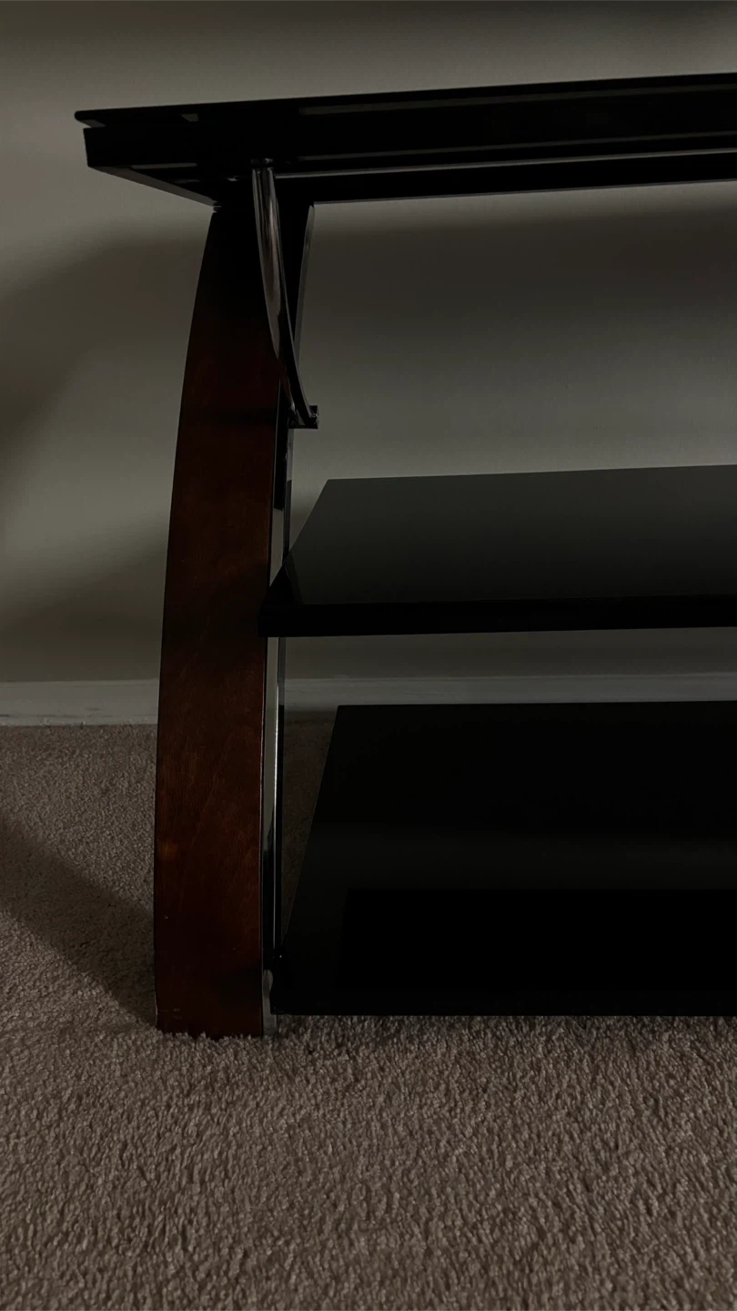 5Selling a black glass TV stand with multiple shelves. It's in good condition and perfect for organizing your entertainment system. The stand features a sleek design with dark wood accents. The measurements are shown in pictures at the end.