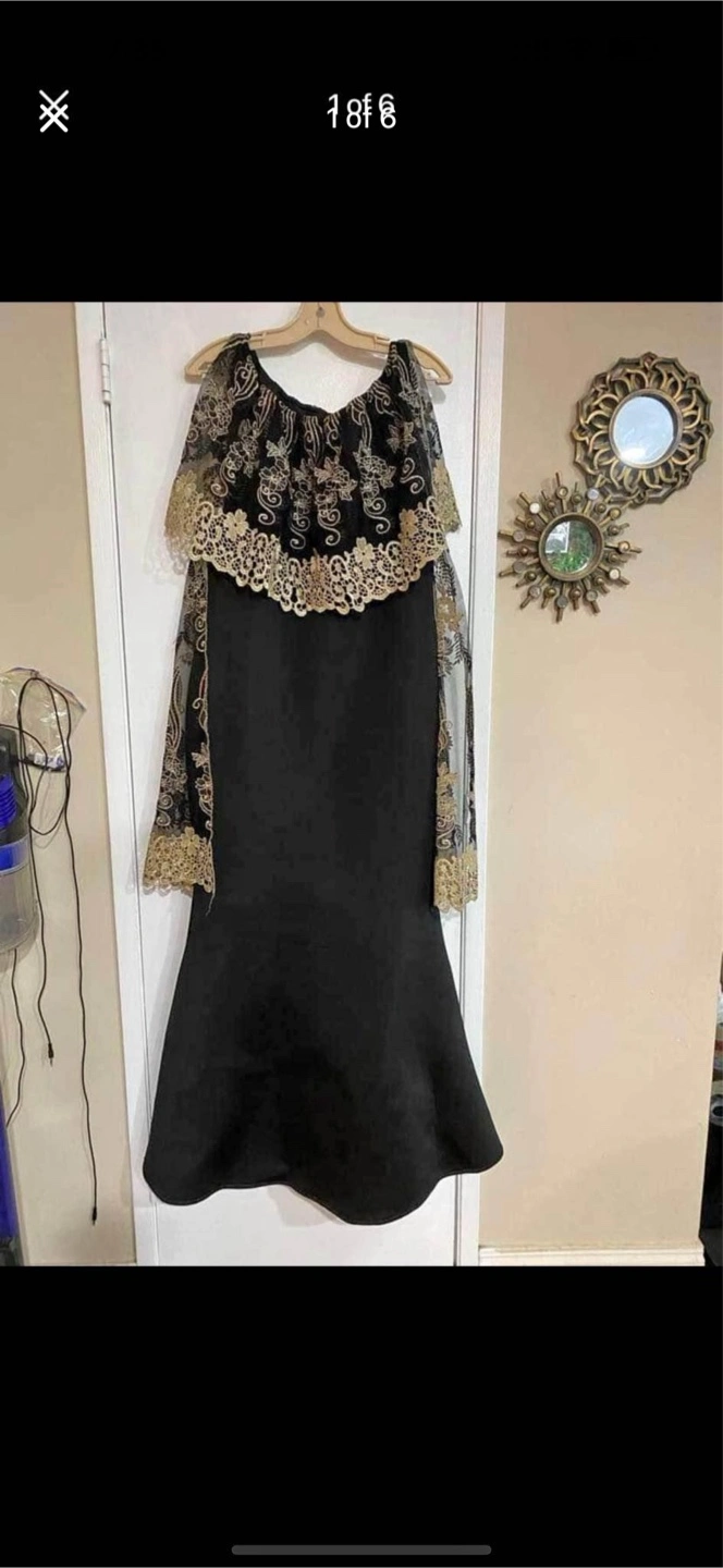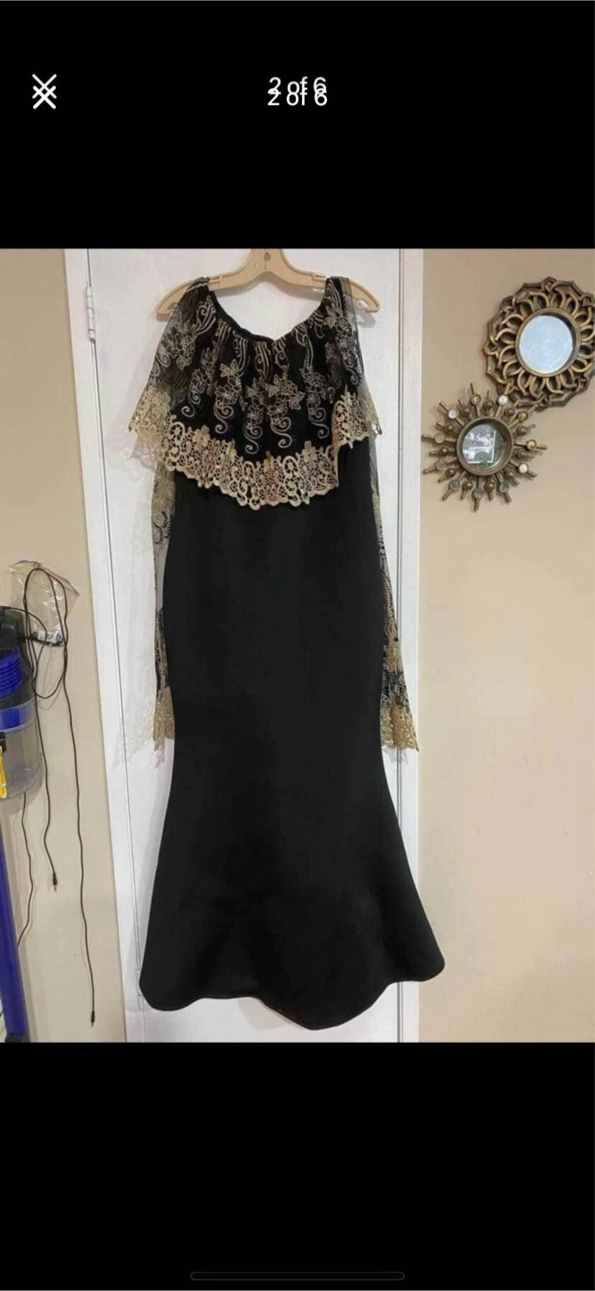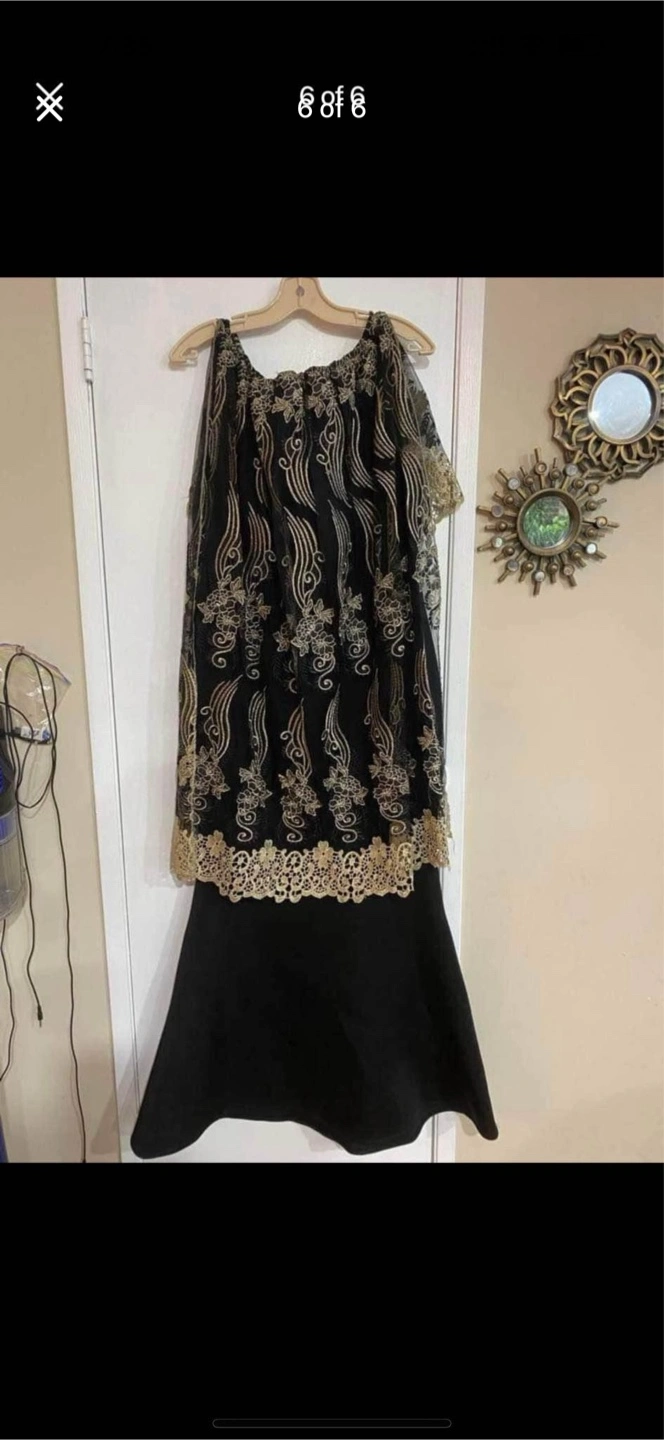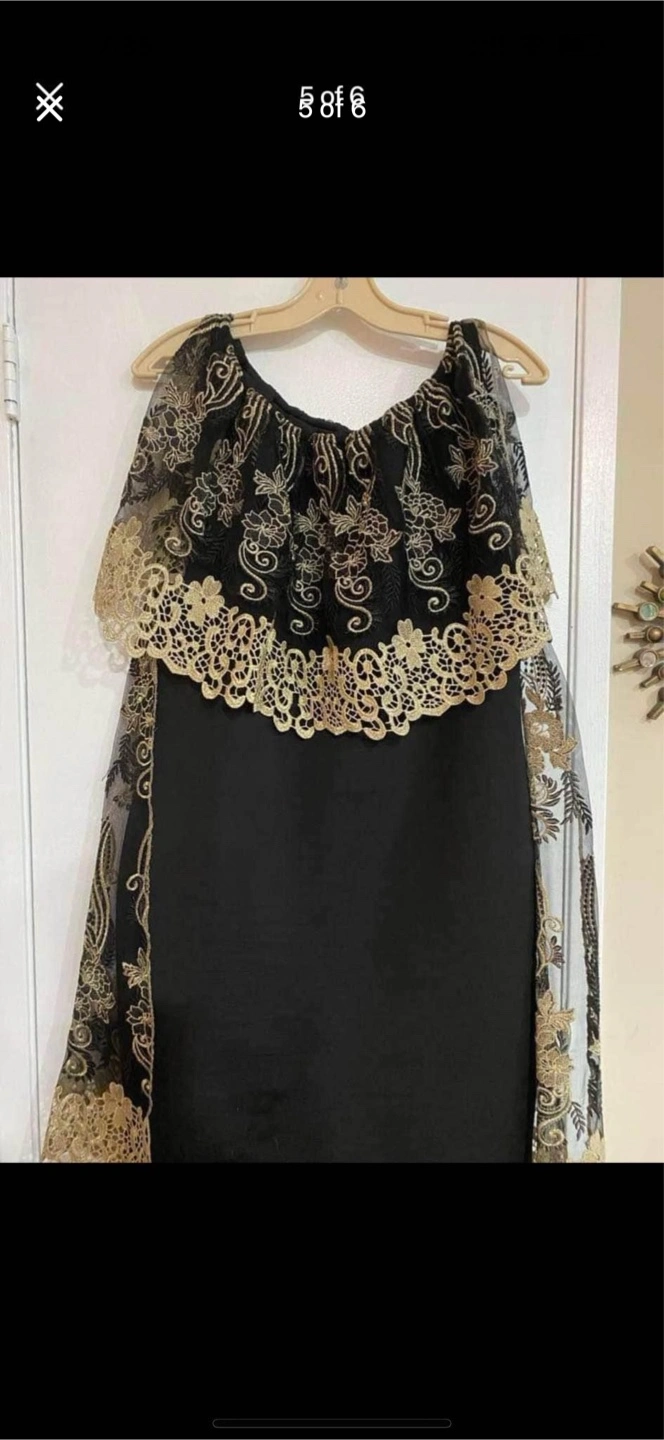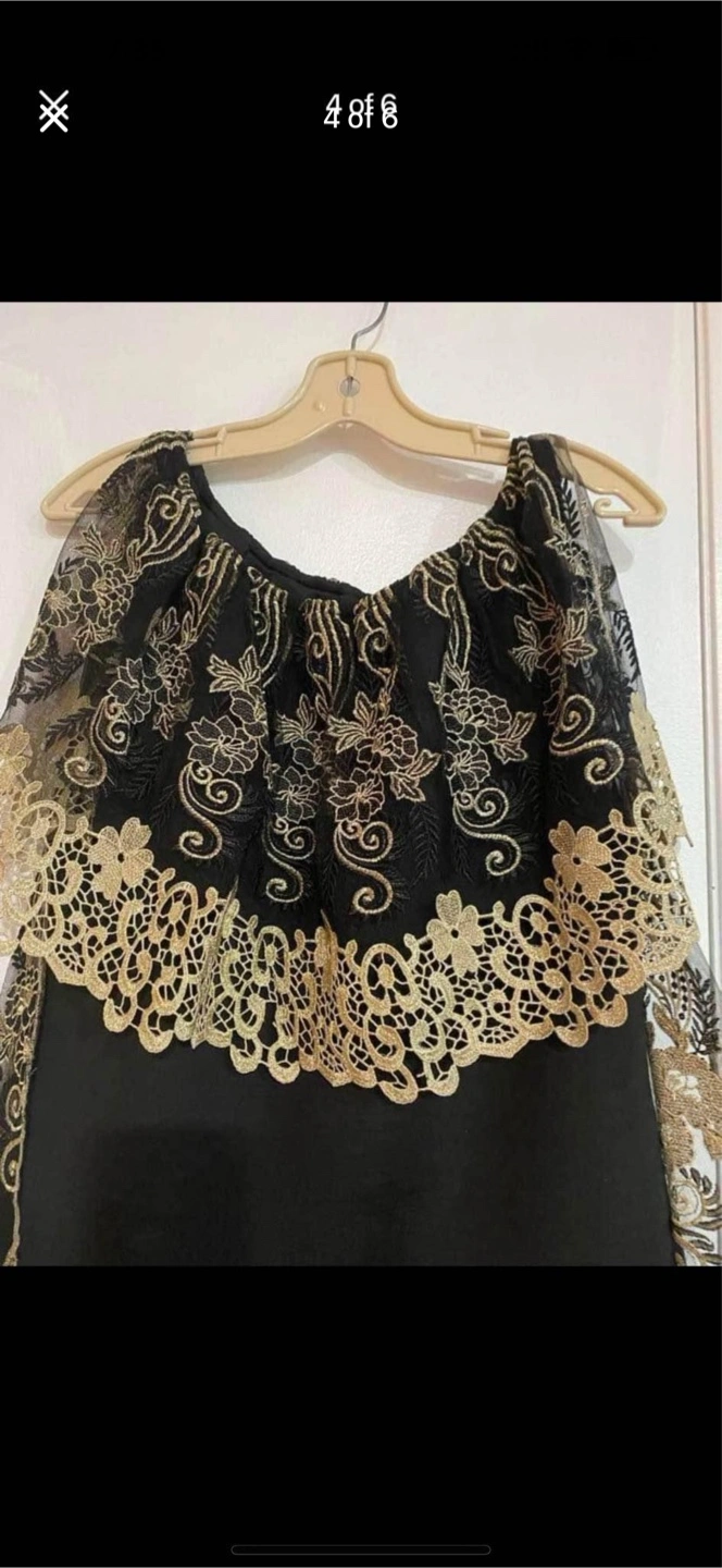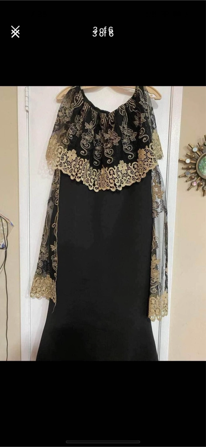 Selling a beautiful black dress with gold lace detailing! It's in great condition and perfect for a special occasion. The dress features a fitted bodice and a flowing skirt.