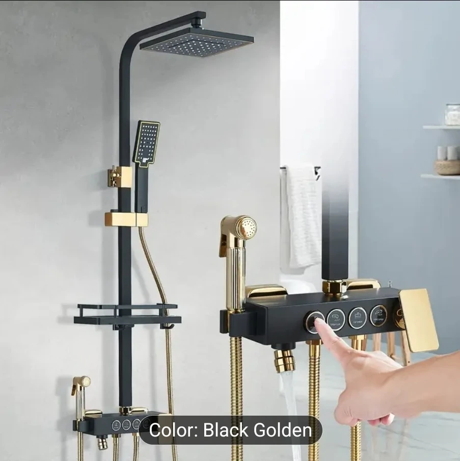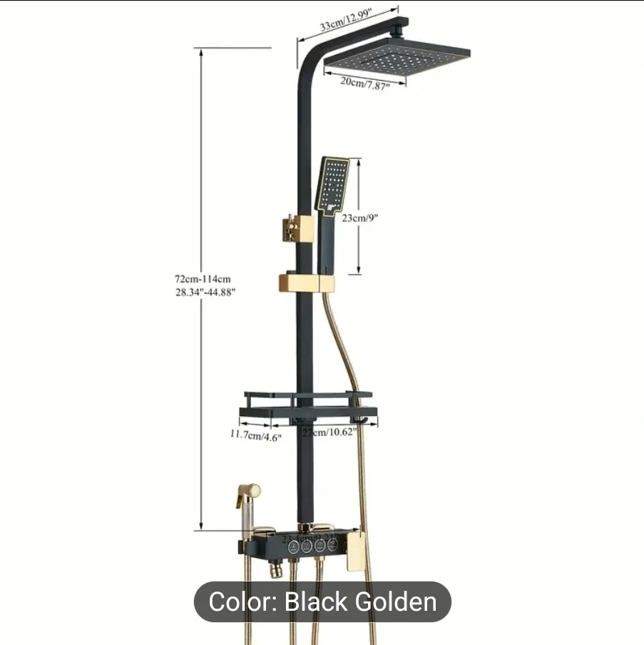 25Here's a sleek shower system in black and gold. It features a square rainfall shower head with 360° rotation, silica holes, and air mix technology. The system also includes a handheld shower head and a control panel with multiple functions. It's a stylish upgrade for any bathroom! luxurious black and golden shower 🚿 system with multi functional water spray 8" shower head rainfall head and 4 washer tube faucet, handheld spray. complete bathroom kit. all accessories included inbox, easy installation and secure wall mount parts are included in box. minimum order of 2 sets, same color and functionality. for more information please don't hesitate to send your concern or questions to this Email, Shaneasa1@gmail.com and you will be contacted by one of our sales manager. ** All products are being shipped to you directly from factory, thus it's your responsibility to clearance from custom agency.** we do our best to make sure you get your product ASAP and help you get your parcel with ease and secure. each set has its all components and accessories included. With retail value of Over $590.00 + taxes each , this is the best offer and price for this deal. All instructions are available inside the box 📦.
