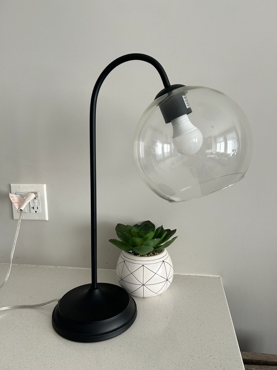 5Modern minimalist design. Features a sleek black metal base and arm. Clear glass globe shade. Inline on/off switch. Perfect for a bedroom or office. Never used, kept in storage.