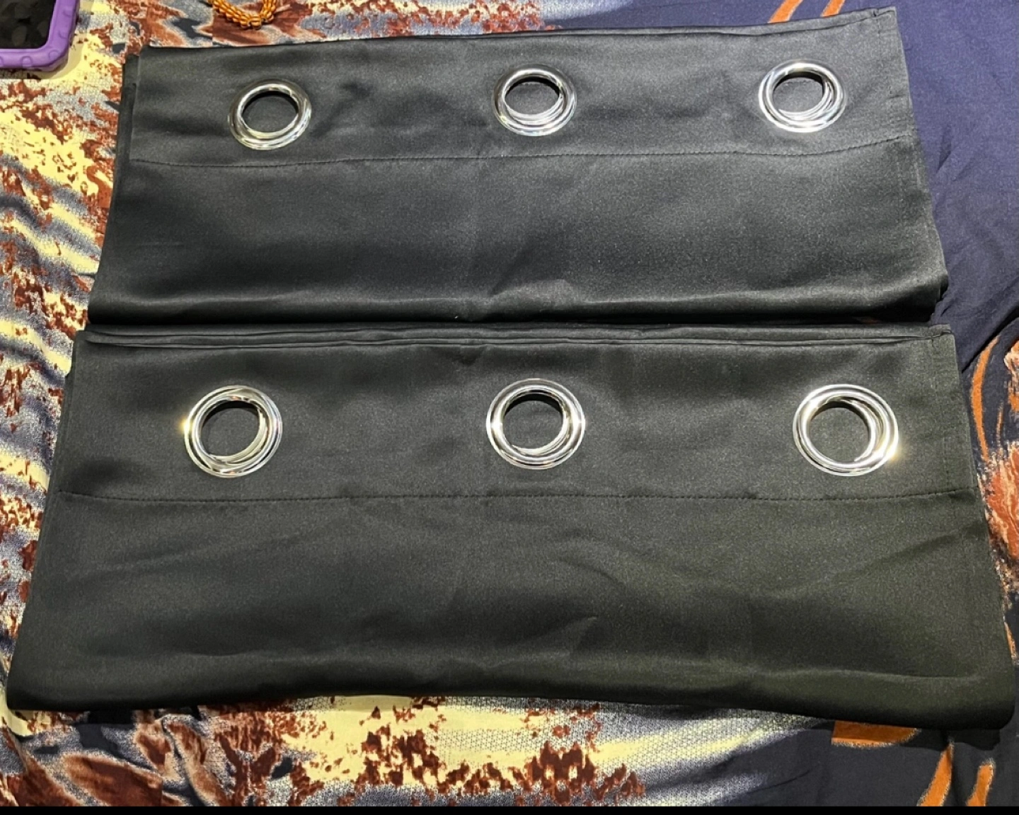 Pair of black curtains. Grommet top. Silky material. 52 wide x 72 long each piece 104 wide x 72 long for the pair Pickup in Brampton or Lawrence/Weston rd area. (For Lawrence/Weston rd pickup you’ll have to let me know the day before.)