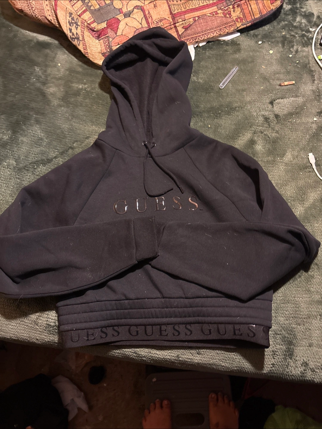 Women's black cropped Guess hoodie. Features a drawstring hood and Guess branding. Good condition.