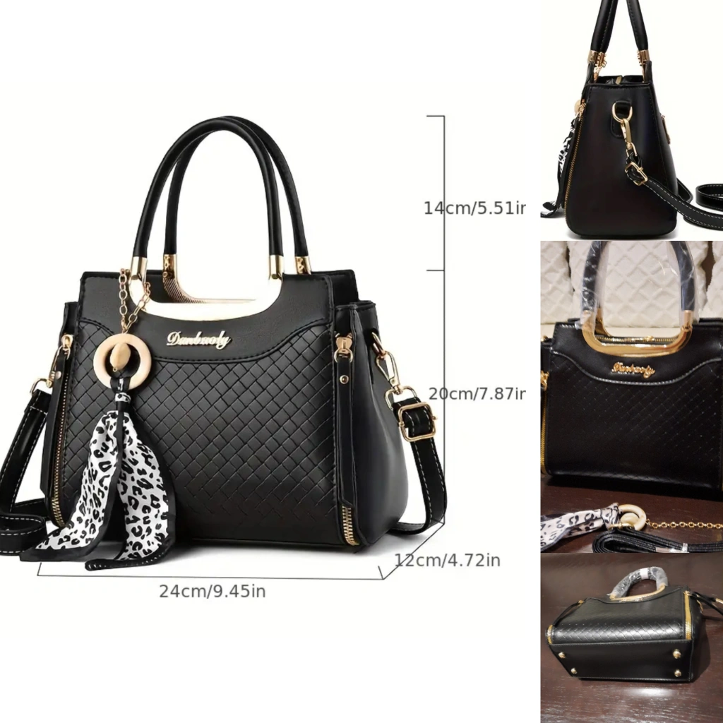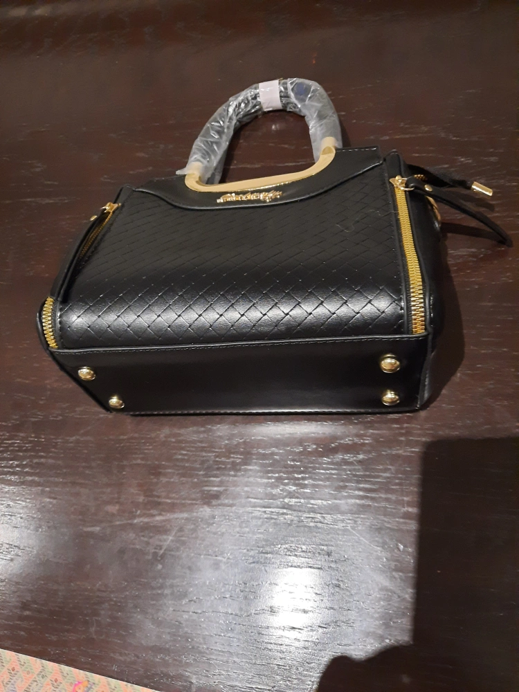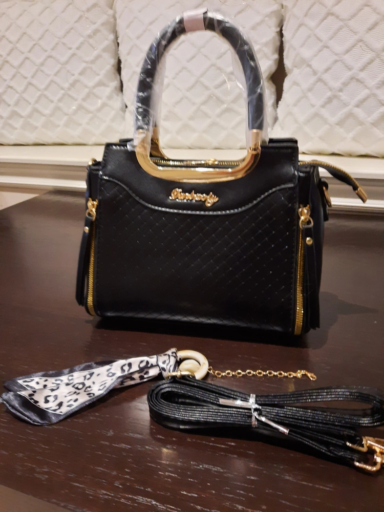 22brand new ladies Black handbag with gold accents. Features a top handle, a detachable shoulder strap, and a small scarf. Has a zipper closure