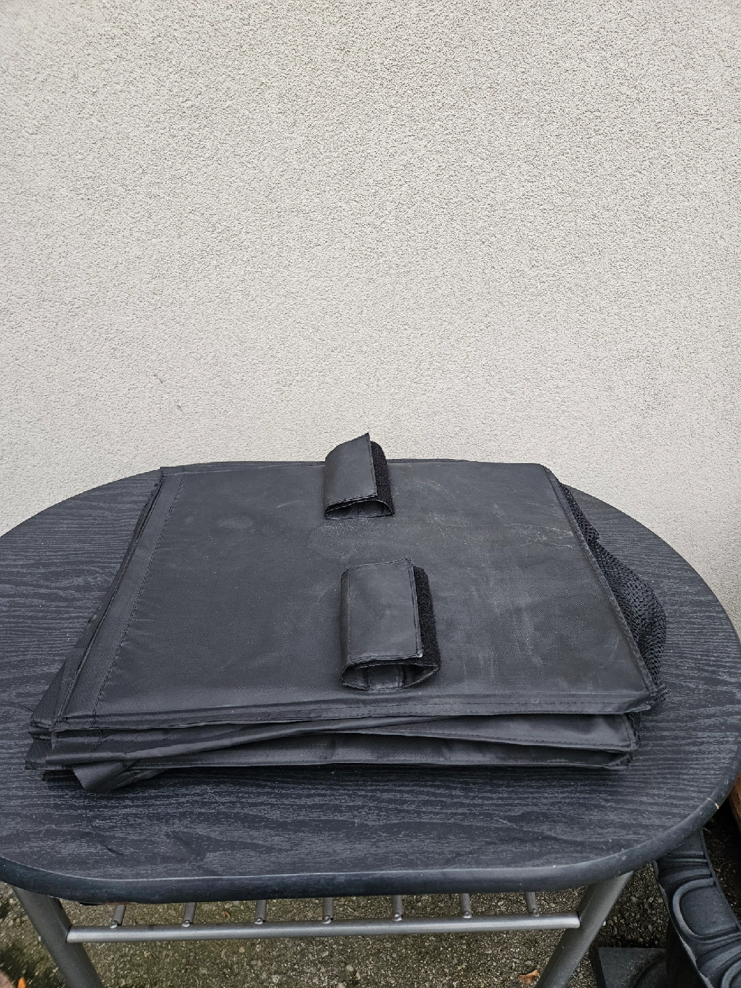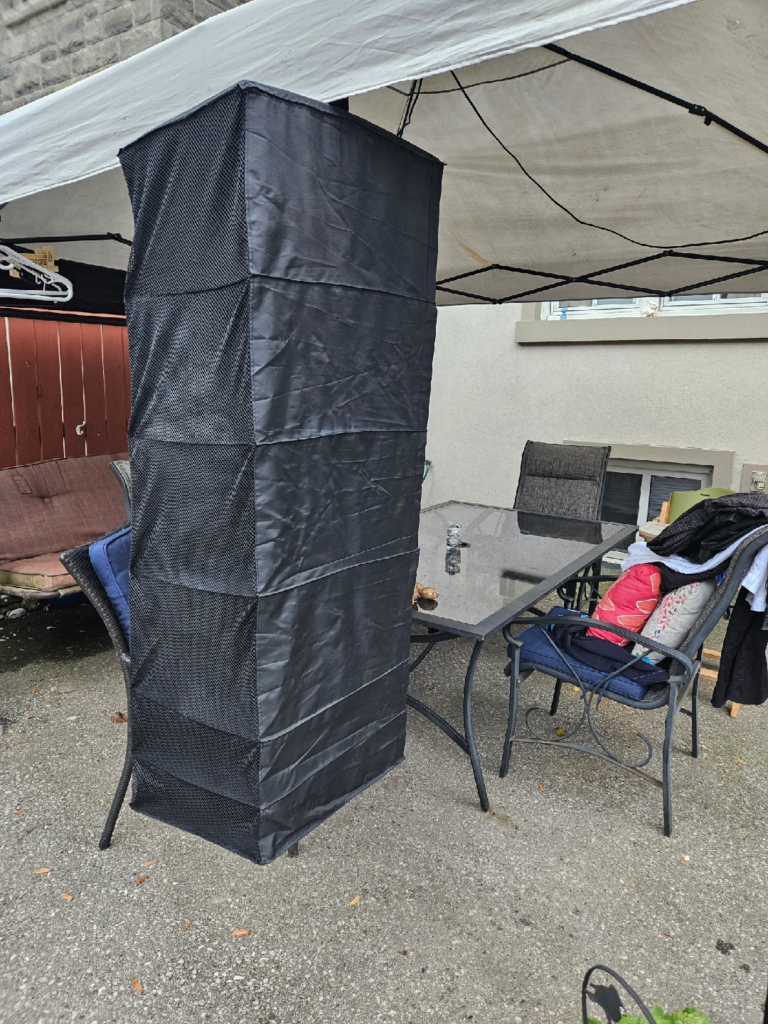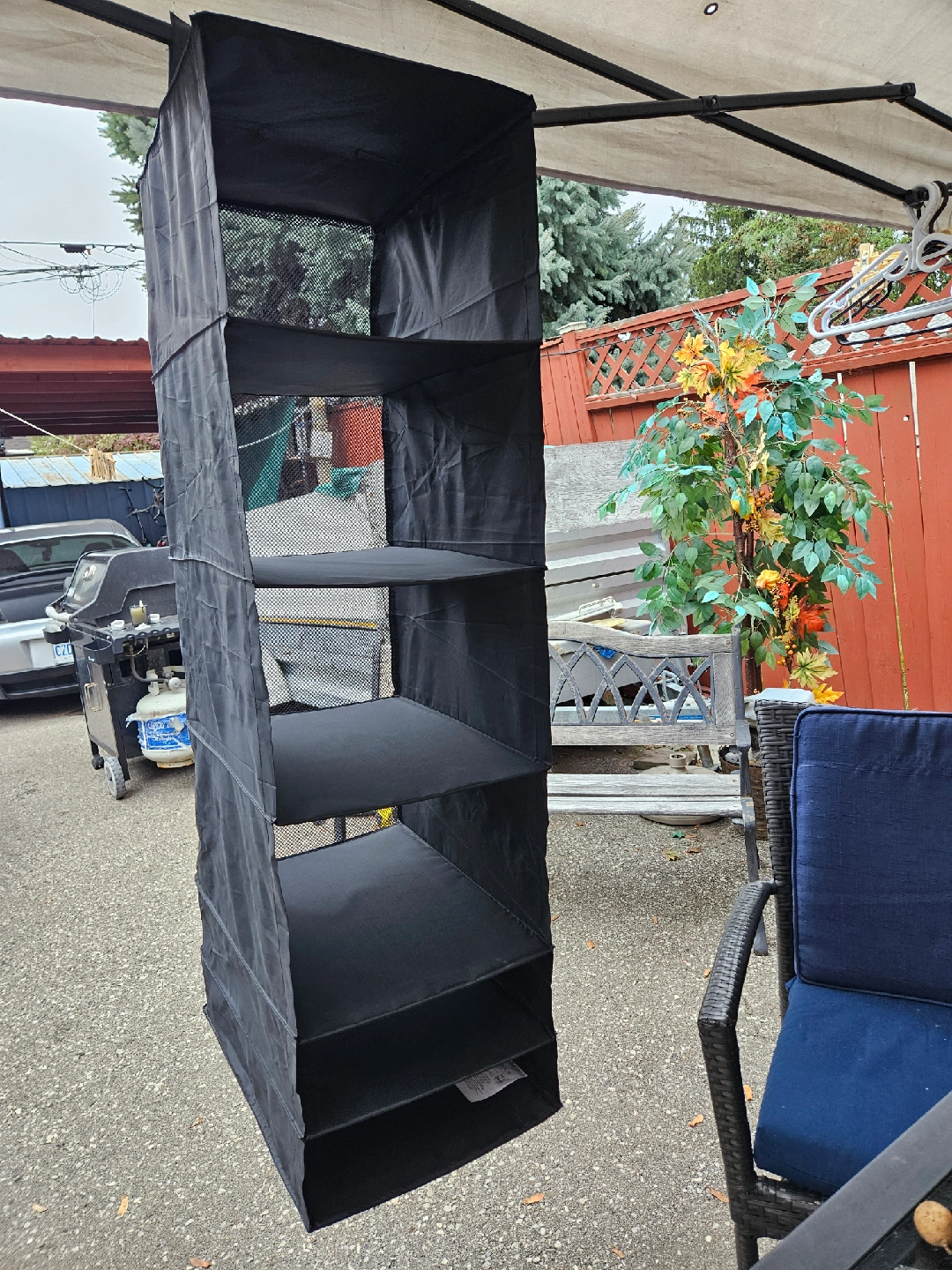 Here's a handy black hanging closet organizer to help maximize your closet space! It measures 35x45x125 and is made with 100% polyester fabric with polypropylene plastic inserts