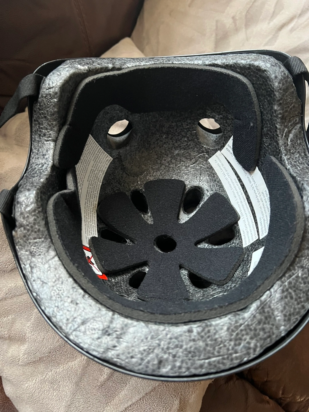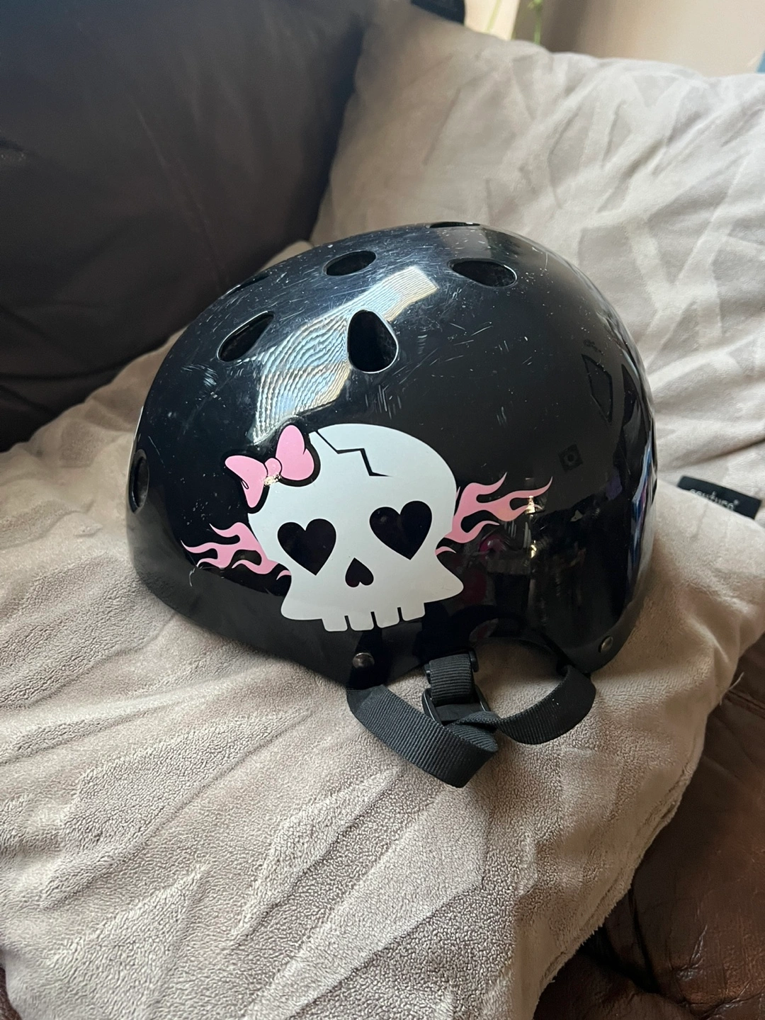 Selling a black helmet that's perfect for biking, skateboarding, or rollerblading! It features a cool skull design with a pink bow and flames. It has some scratches but is still in good condition and ready to keep you safe on your adventures