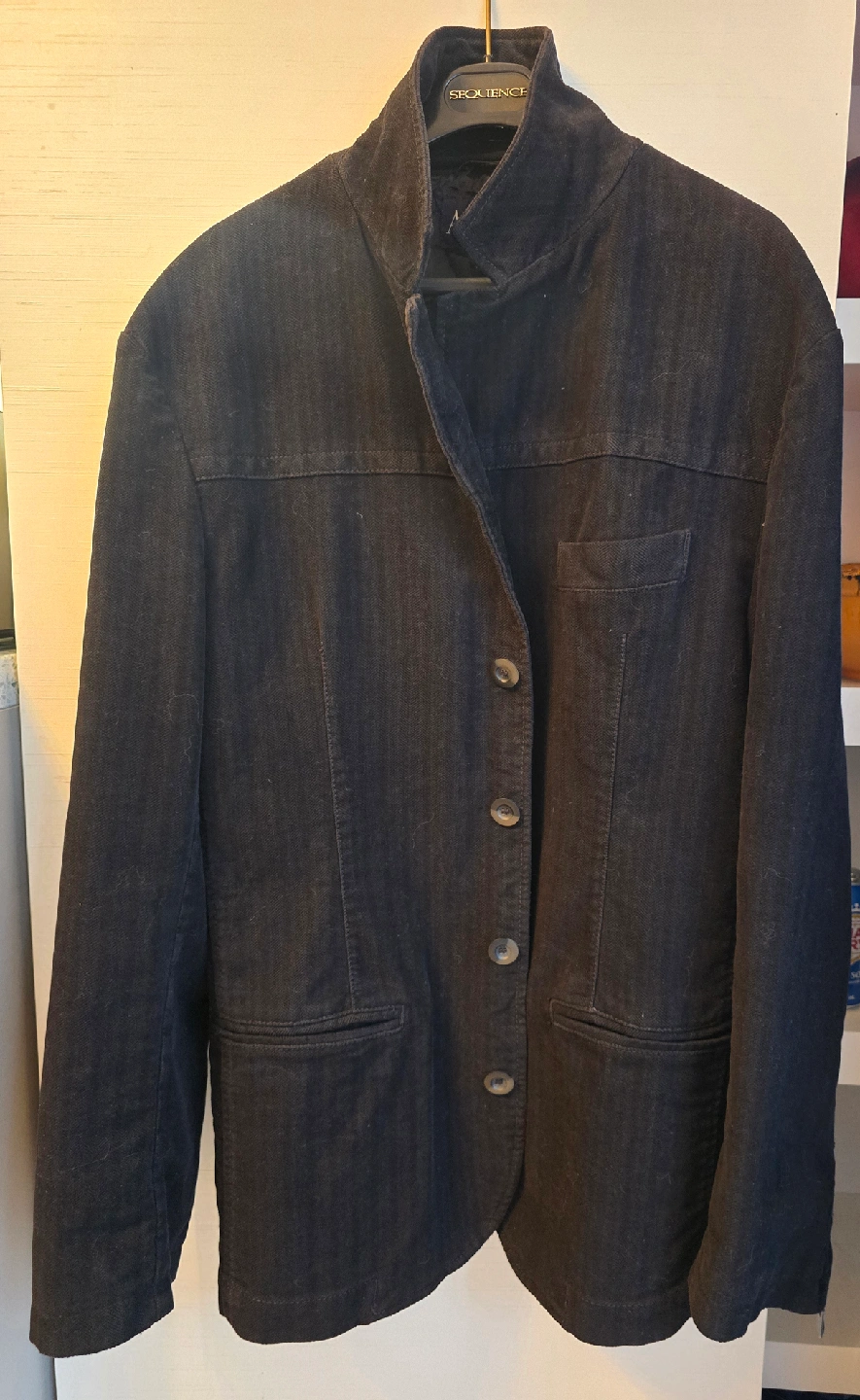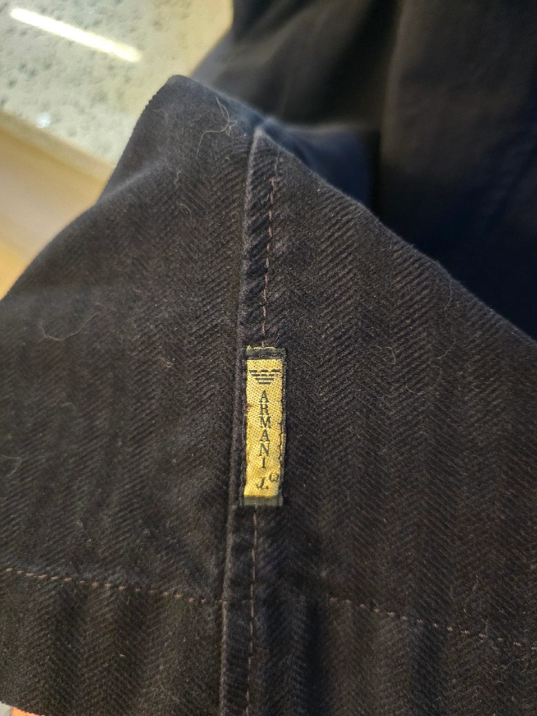 114Here's a stylish black armani jacket with a unique herringbone pattern! It features a button-up front and interesting zipper details on the sleeves. Perfect for adding a touch of sophistication to your wardrobe