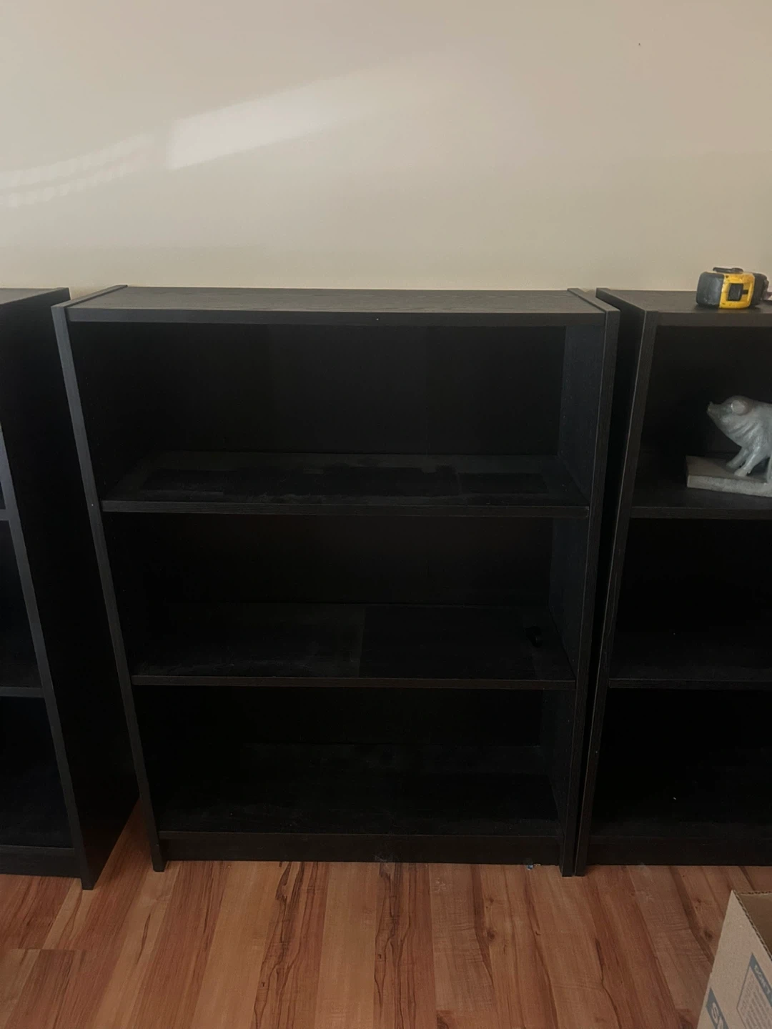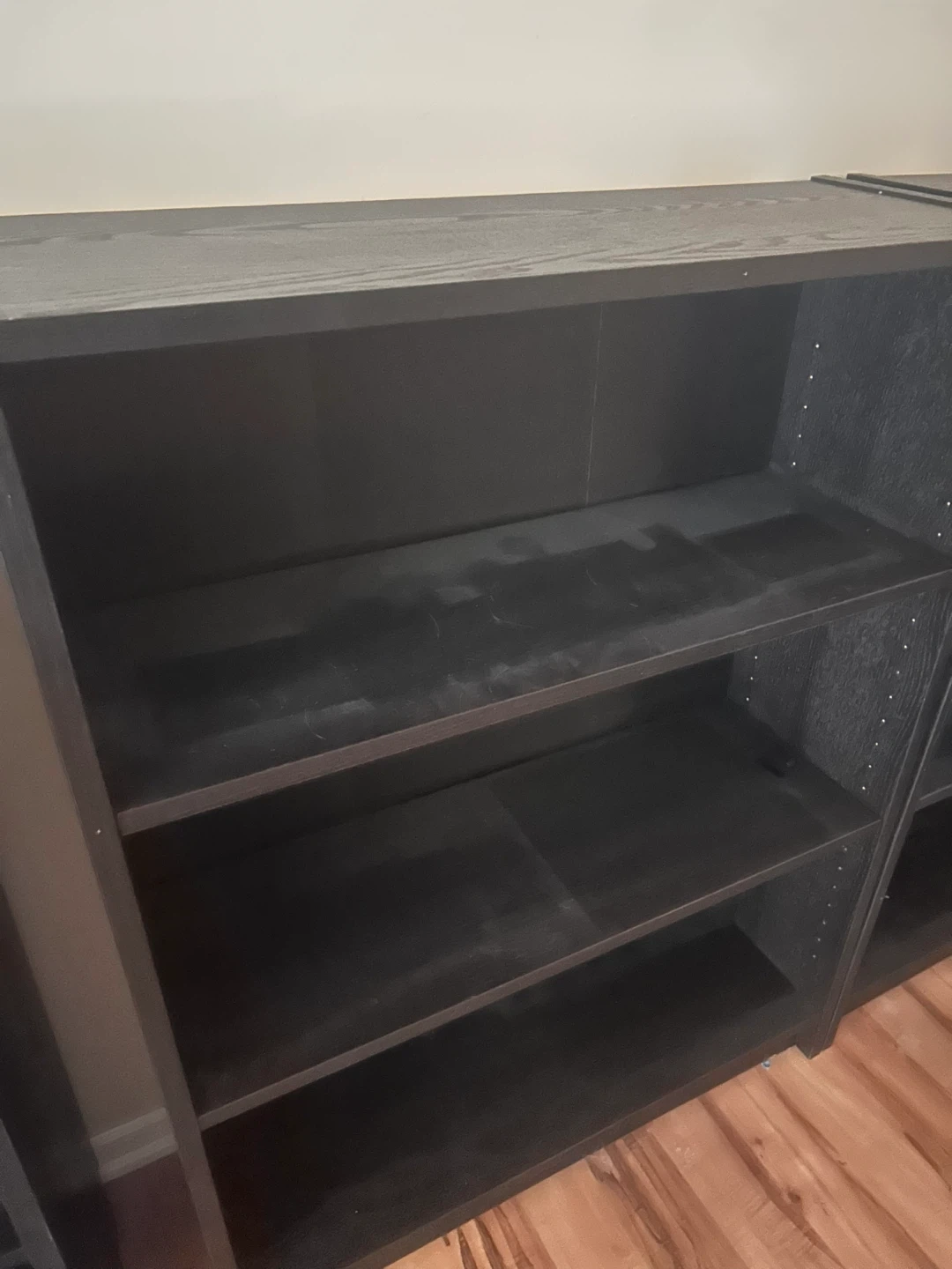 Selling a black bookcase. I have two of this size and two of the smaller size available. One of them is in better condition than the other - the one in worse condition needs the back piece secured a bit better than it is now. Non smoking house with a cat. Pick up St. Albert Woodlands area