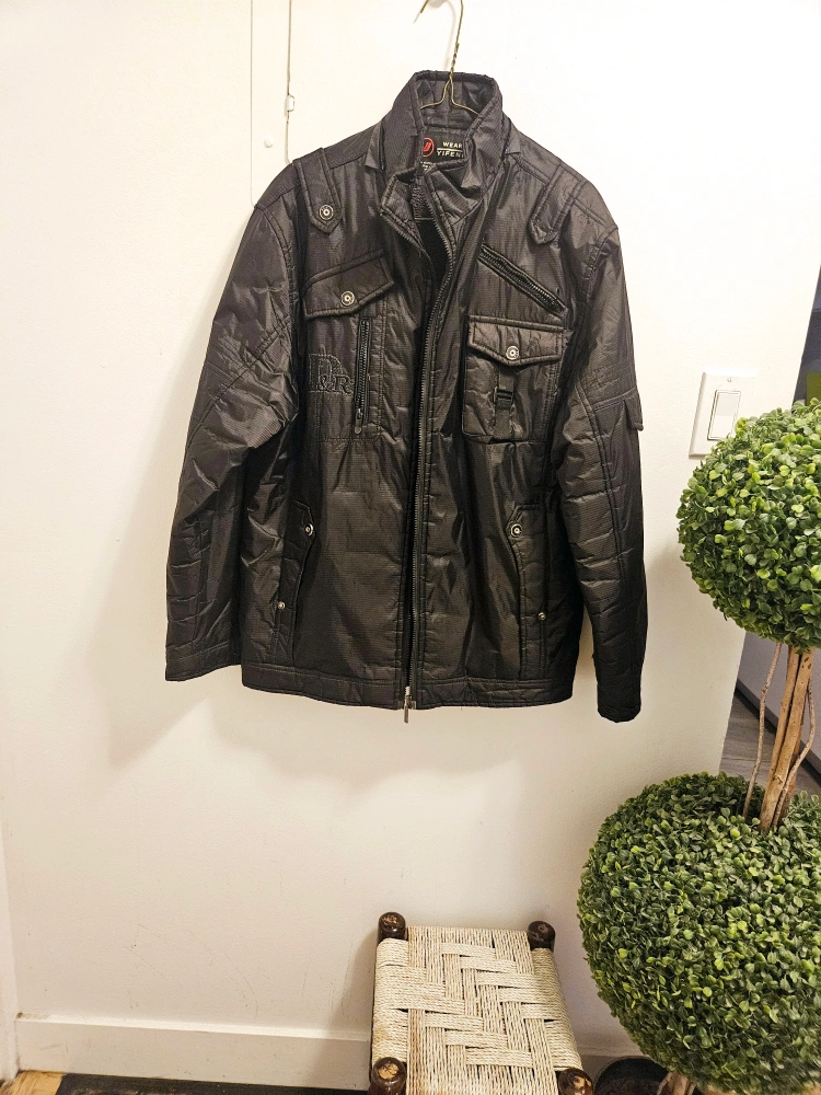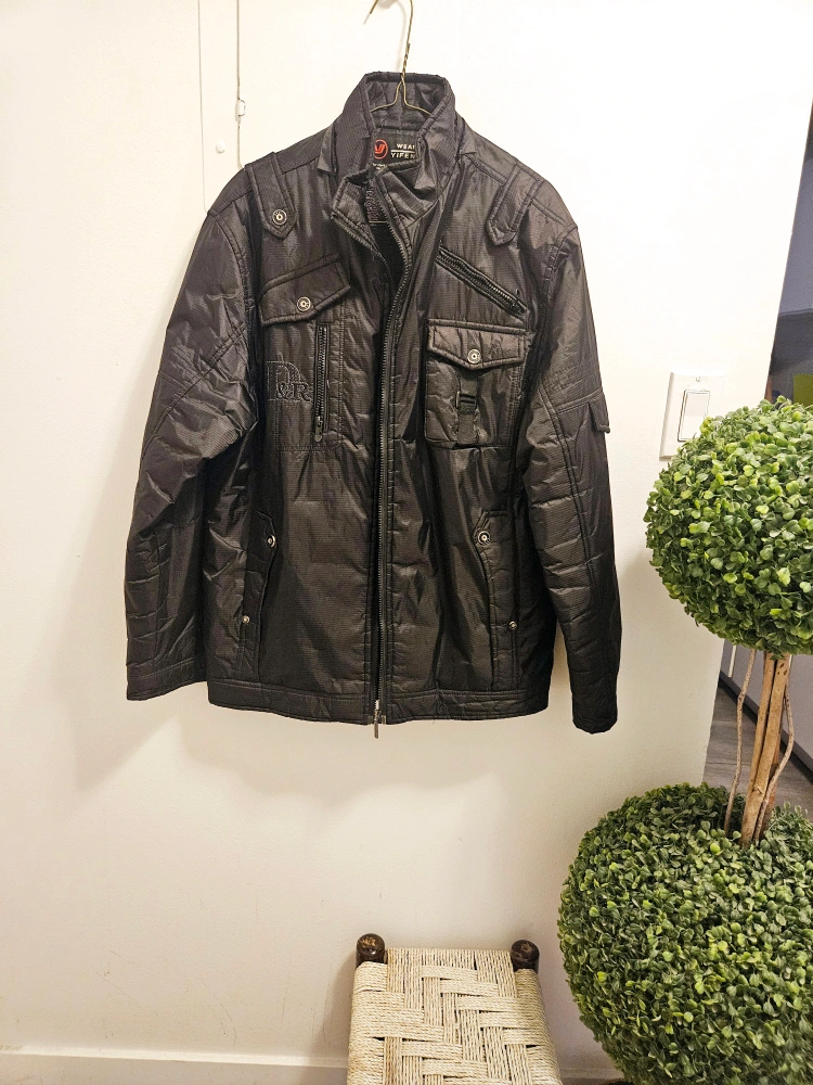 15Black jacket with a zipper closure. It has multiple pockets. The jacket is fleece lined. You can wear it on a cold evening to feel cozy and relaxed. Pickup from Granville Skytrain station or Park Royal Mall