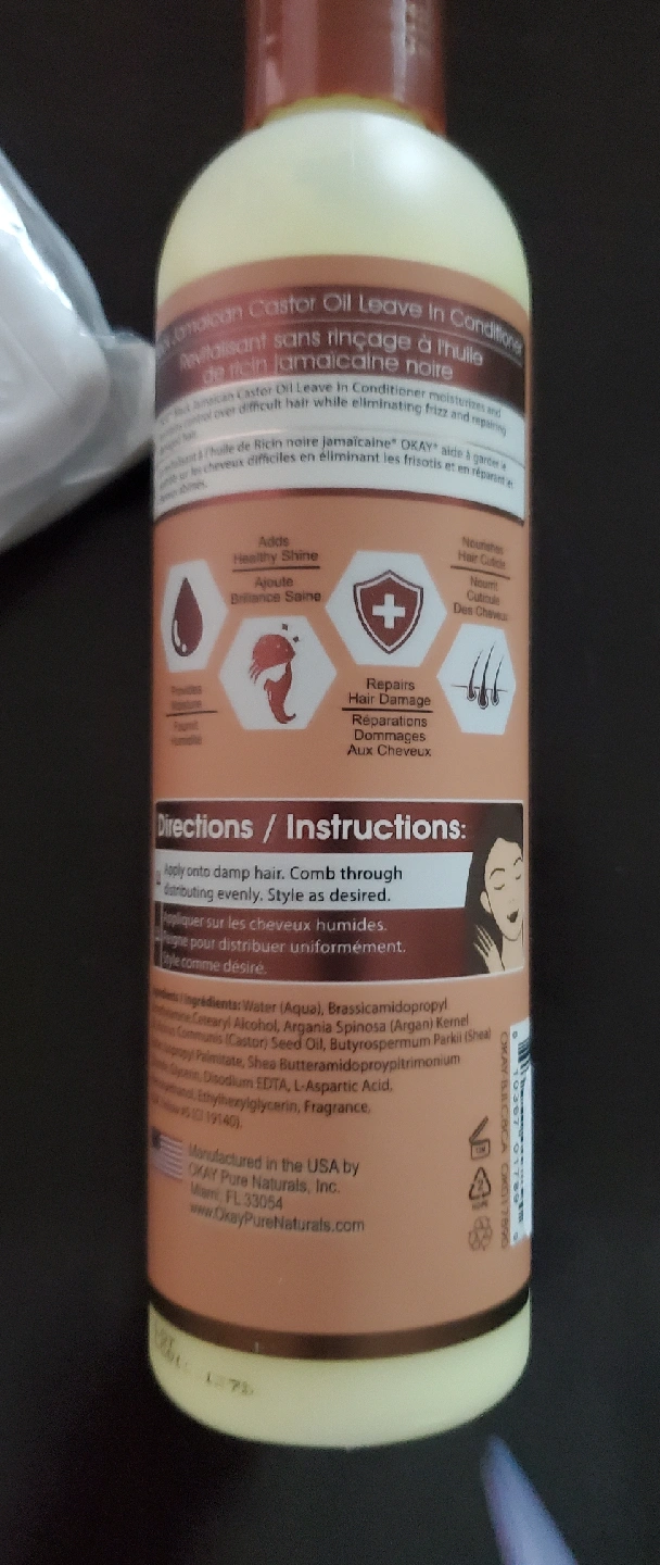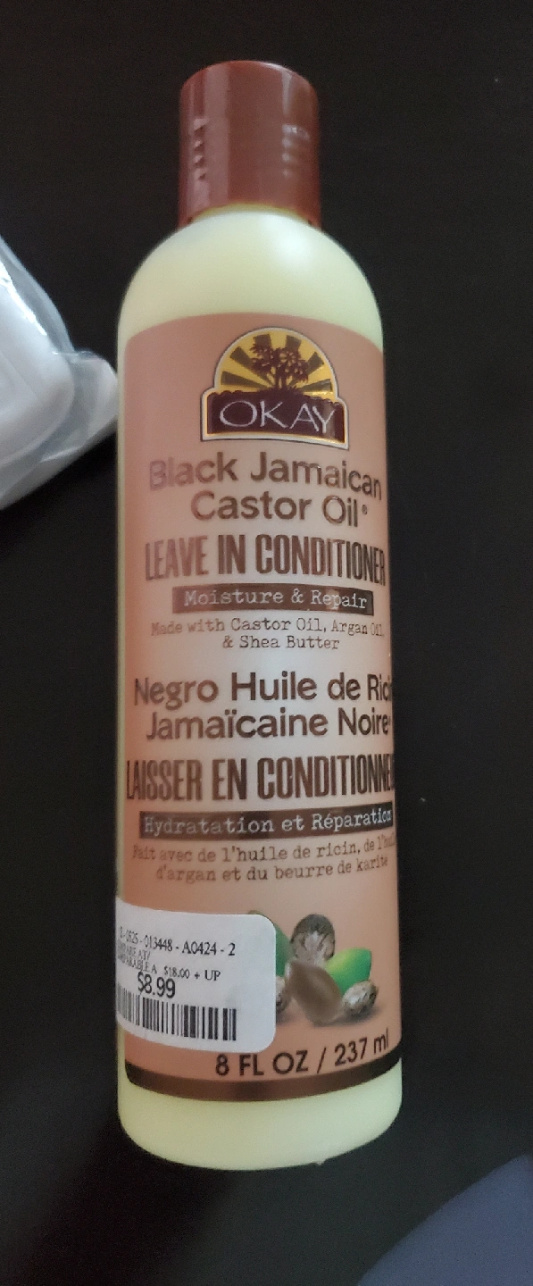 This is a bottle of Okay Black Jamaican Castor Oil Leave-In Conditioner. It's designed for moisture and repair, made with castor oil, argan oil, and shea butter. It adds healthy shine, repairs hair damage, and nourishes hair follicles. Used it only once. Does not suit my hair.