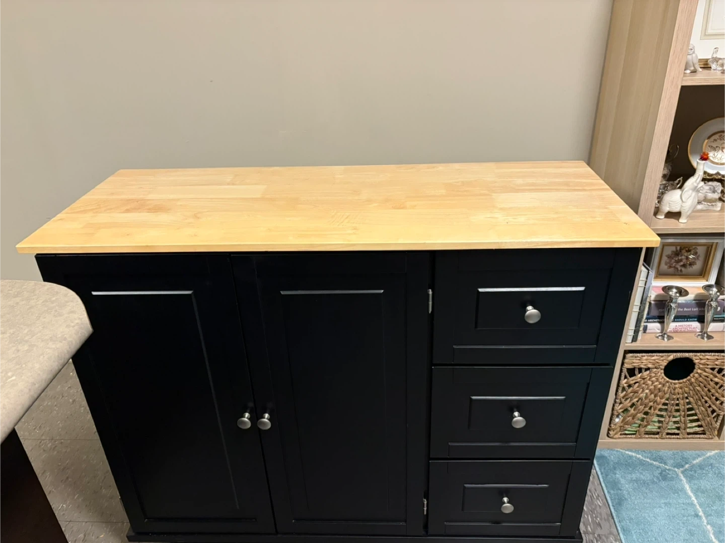 Selling a kitchen island with a black cabinet and a light wood countertop. It features cabinet space with shelves and three drawers for storage and it’s on wheels. It also has a drop leaf for more counter space which can fit 2 stools underneath for a cute breakfast table. Good condition. Perfect for adding extra counter space and organization to a small kitchen. 44” long 36” high Pick up only