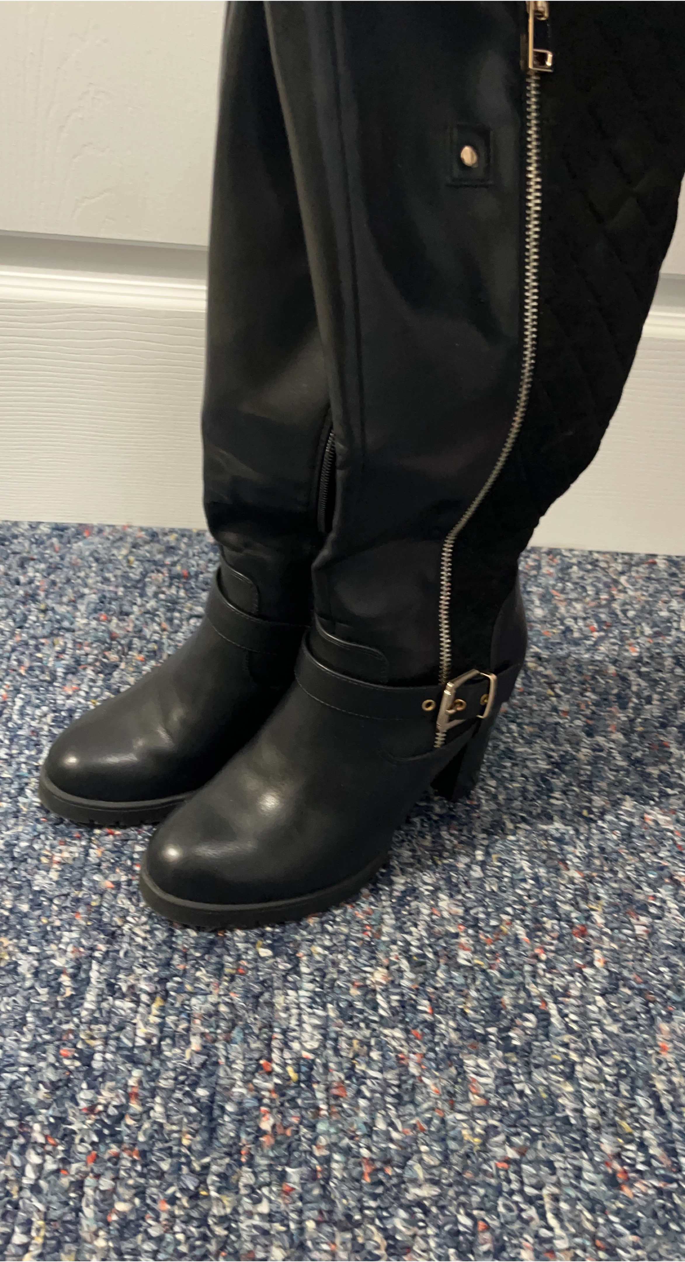 5Selling a pair of black knee-high boots. They feature a side zipper and a buckle detail. Great for fall and winter!