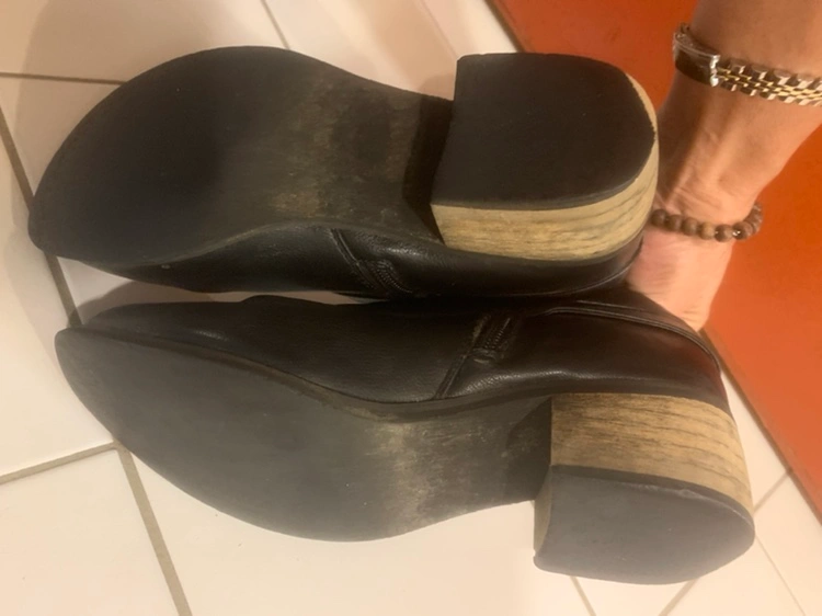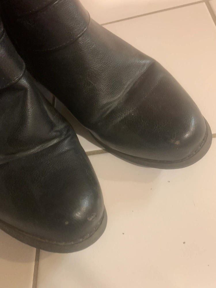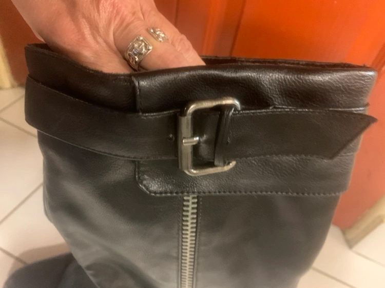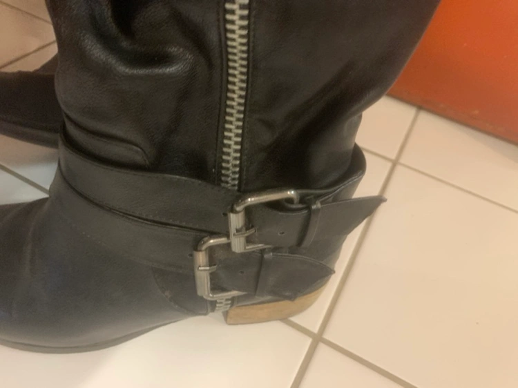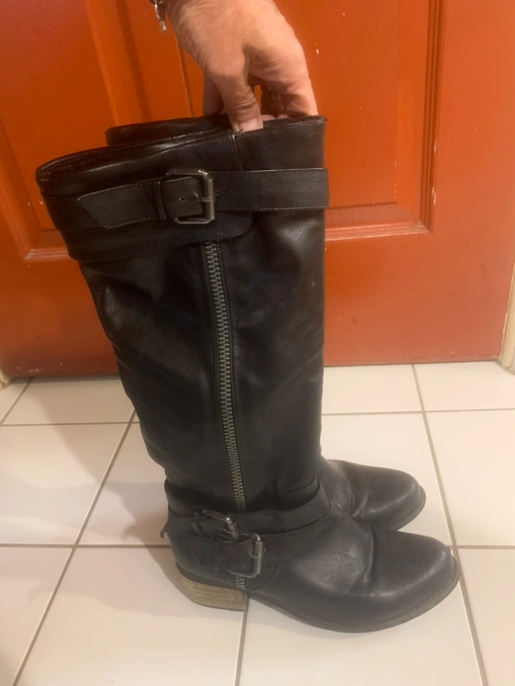 Black knee high boots with side zipper and double buckle detail. Heel height is approximately 2 inches. Size 8. Cash only.
