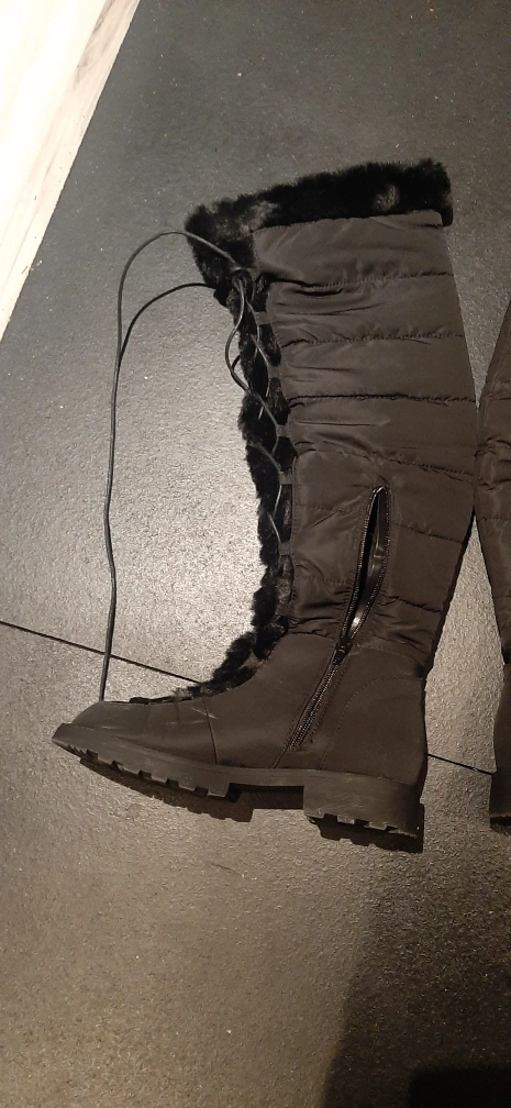 Black knee high lace-up boots with a faux fur lining. Zipper on the inside of the boot. size 8