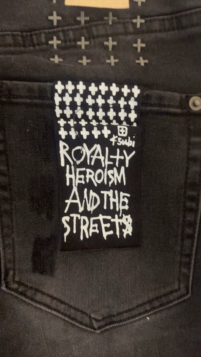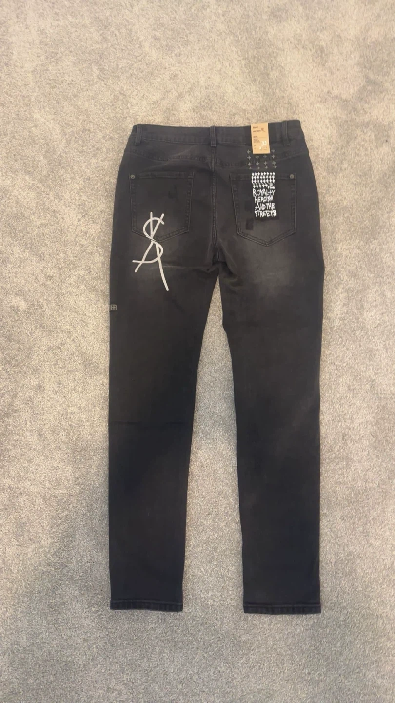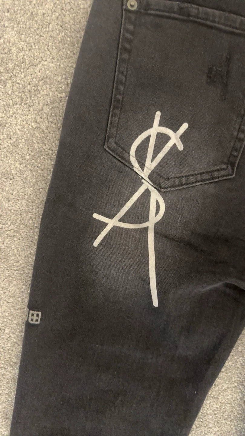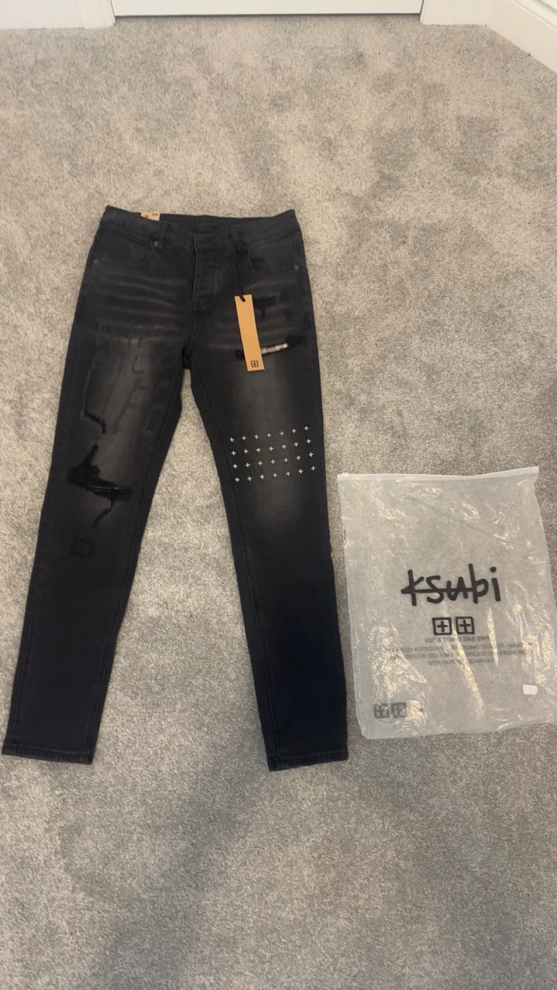 14Selling a pair of black ksubi jeans. They feature a unique design with distressed details and graphic accents. Great for adding an edgy touch to your wardrobe!