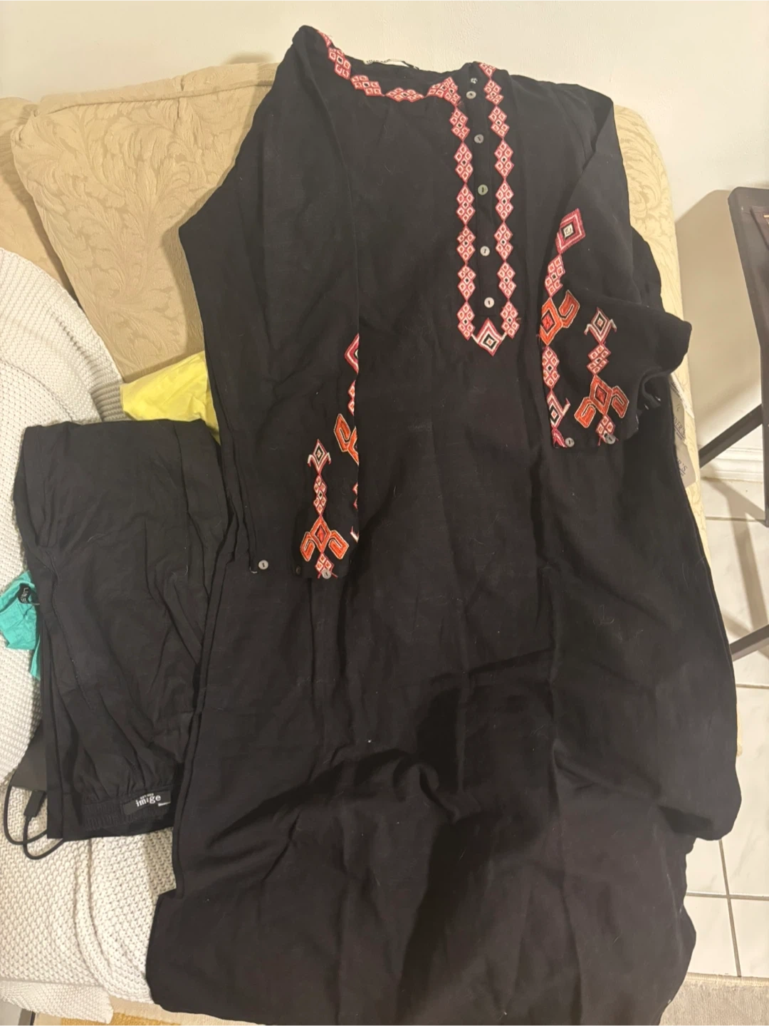 56Selling a black Khaadar kurti with matching lawn trouser . The outfit has a lovely embroidered design. It's in great condition and ready for a new home!