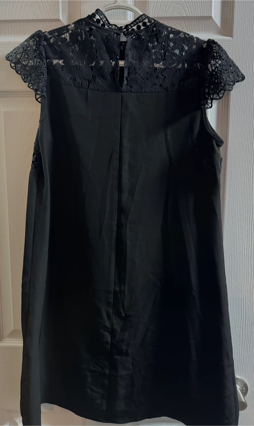 71A lovely black dress with delicate lace detailing! It's in great condition and ready for a new home. The dress features lace around the collar and shoulders, adding a touch of elegance to the simple design.