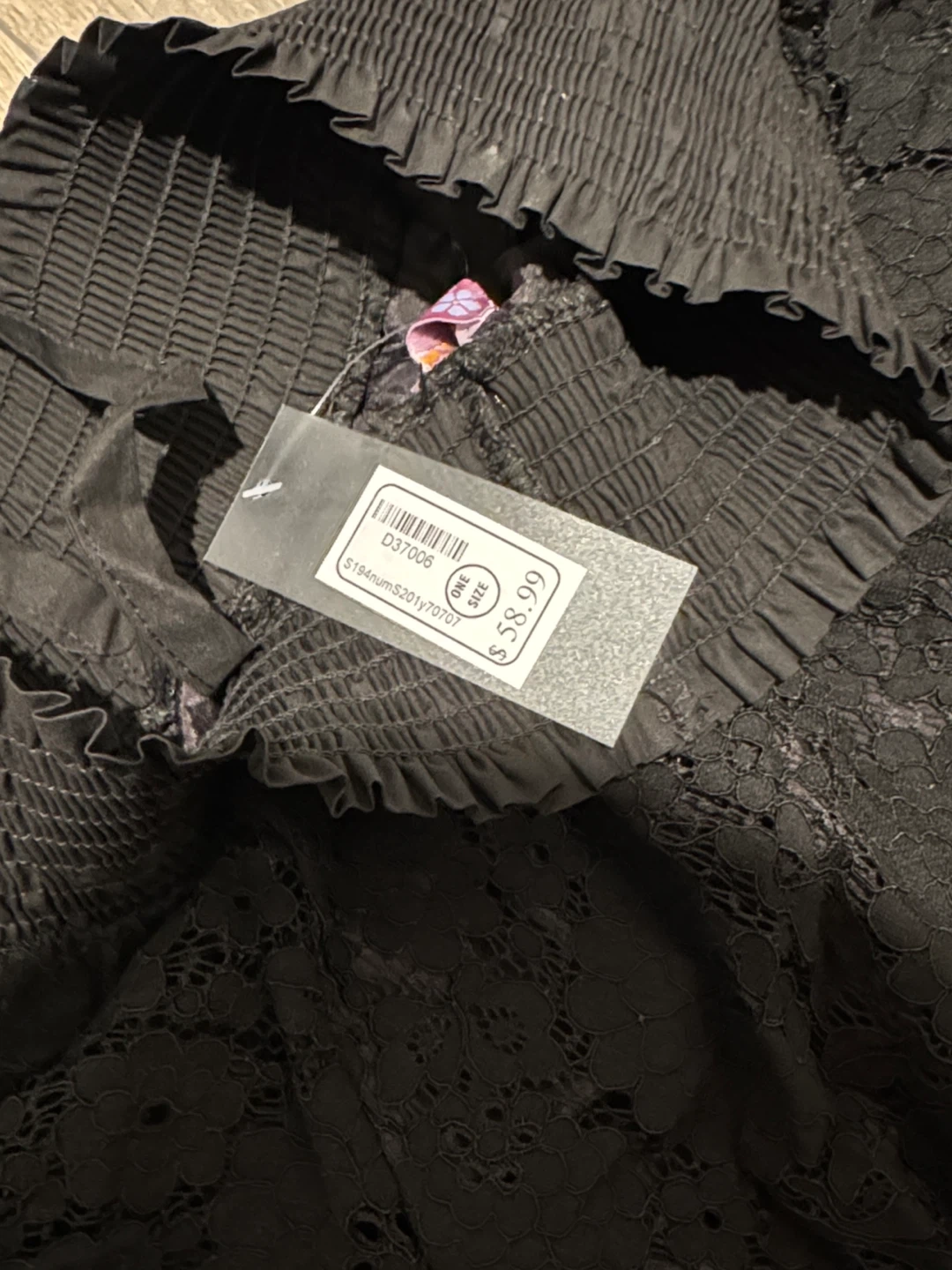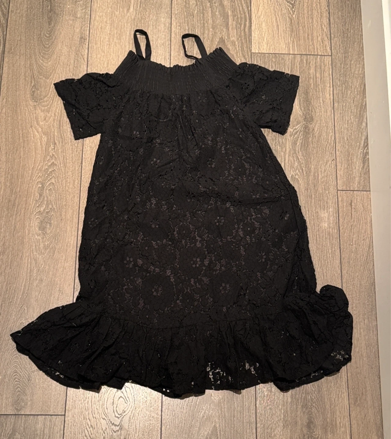 103Selling a cute black lace dress in one size! It's in great condition and features an off-the-shoulder design with spaghetti straps. The original price tag shows $58.99