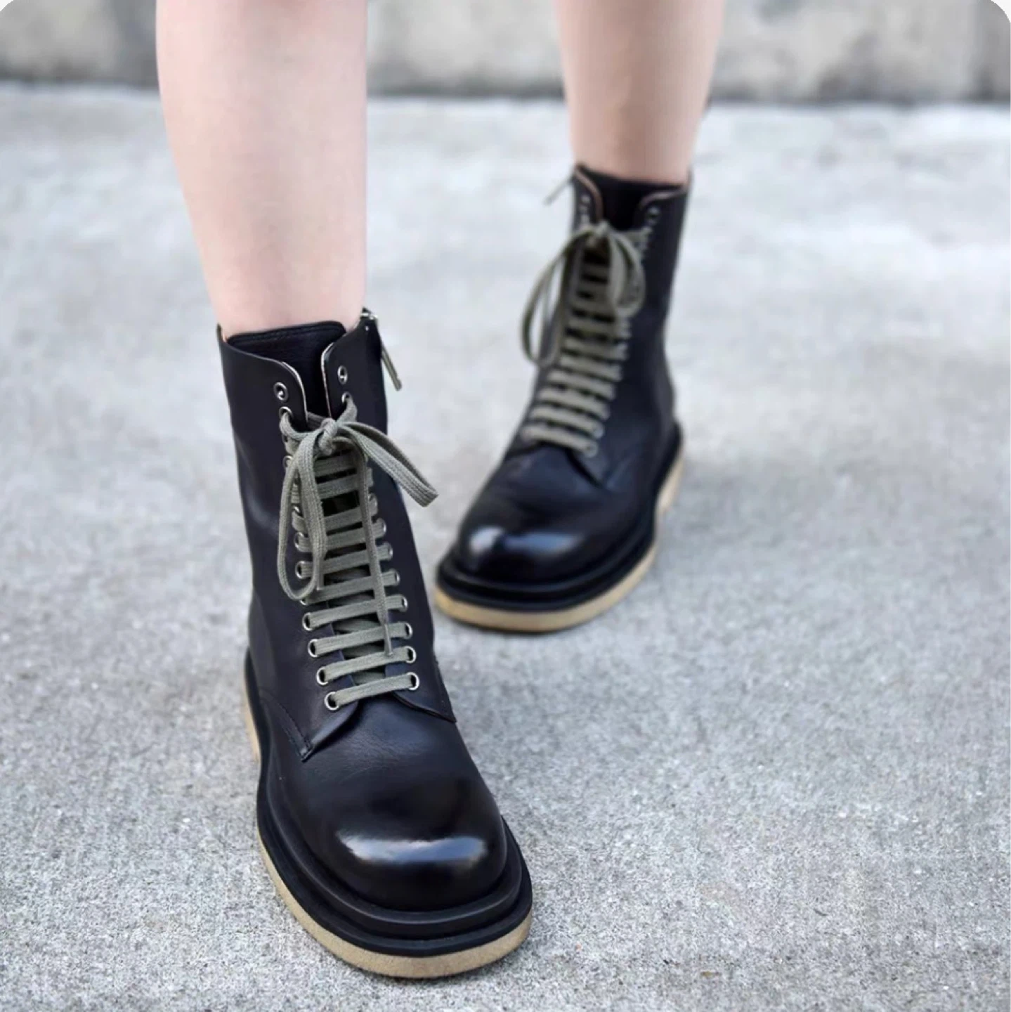 162Selling a pair of lace-up boots in black. They have a unique and stylish design that stands out. Perfect for adding an edgy touch to your wardrobe. Please take a look at the pictures!