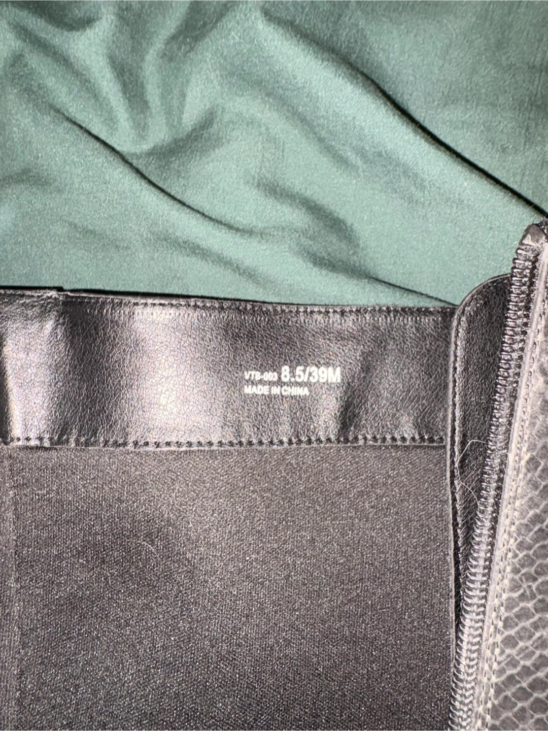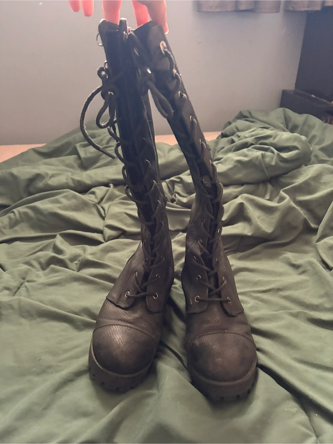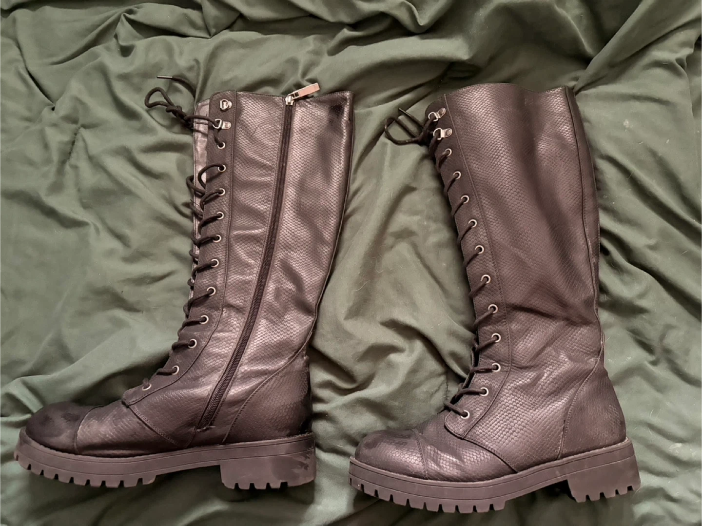 15Selling a pair of black, knee-high lace-up boots! They have a bit of a snakeskin texture and a chunky sole. They're in used condition, but still have lots of life left in them. Barely any wear on the sole or tread, zipper works great. Super comfy. The size is 8.5.