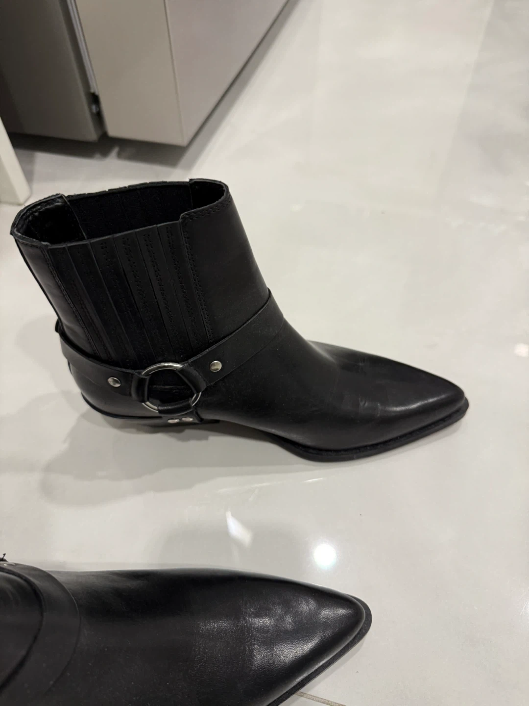 10Selling a pair of black leather ankle boots. They feature a stylish harness detail with a silver ring. These boots are perfect for adding a bit of edge to any outfit!