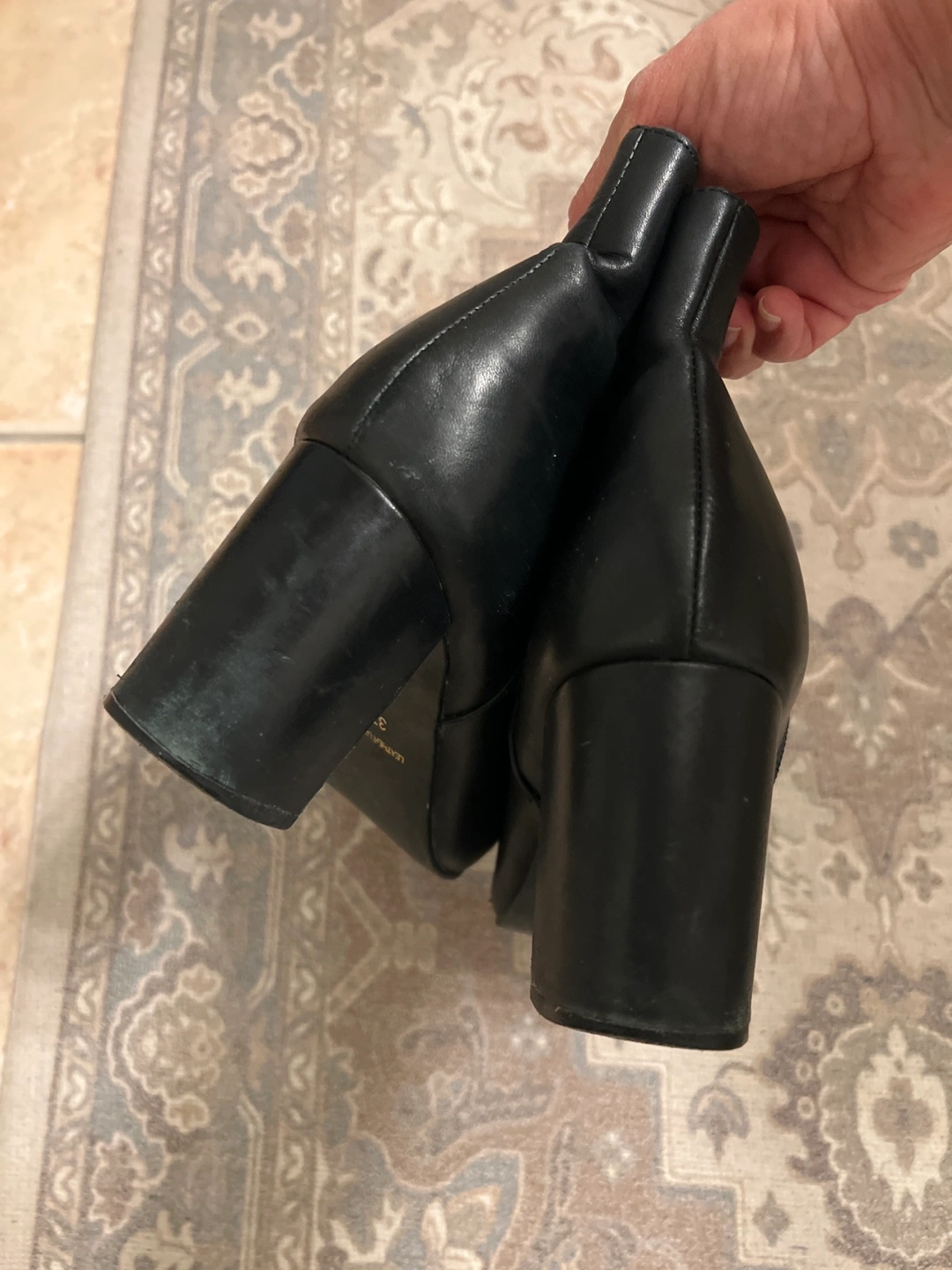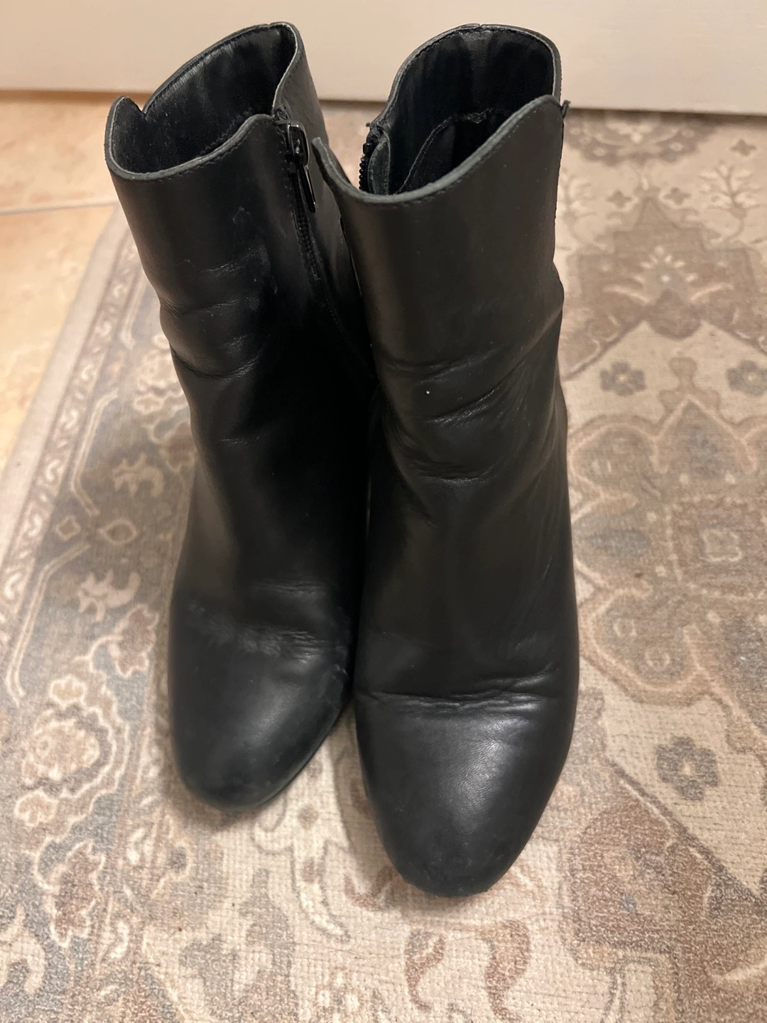 51Women's black leather ankle boots. Features block heels and side zippers. Good for everyday wear. Some scratches on heals