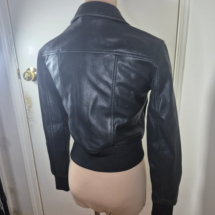 Here's a stylish black leather bomber jacket. It's in great shape and ready for a new home. The jacket features a classic bomber silhouette with a zip-up front and fitted cuffs and hem. It's perfect for adding a touch of edgy style to any outfit!